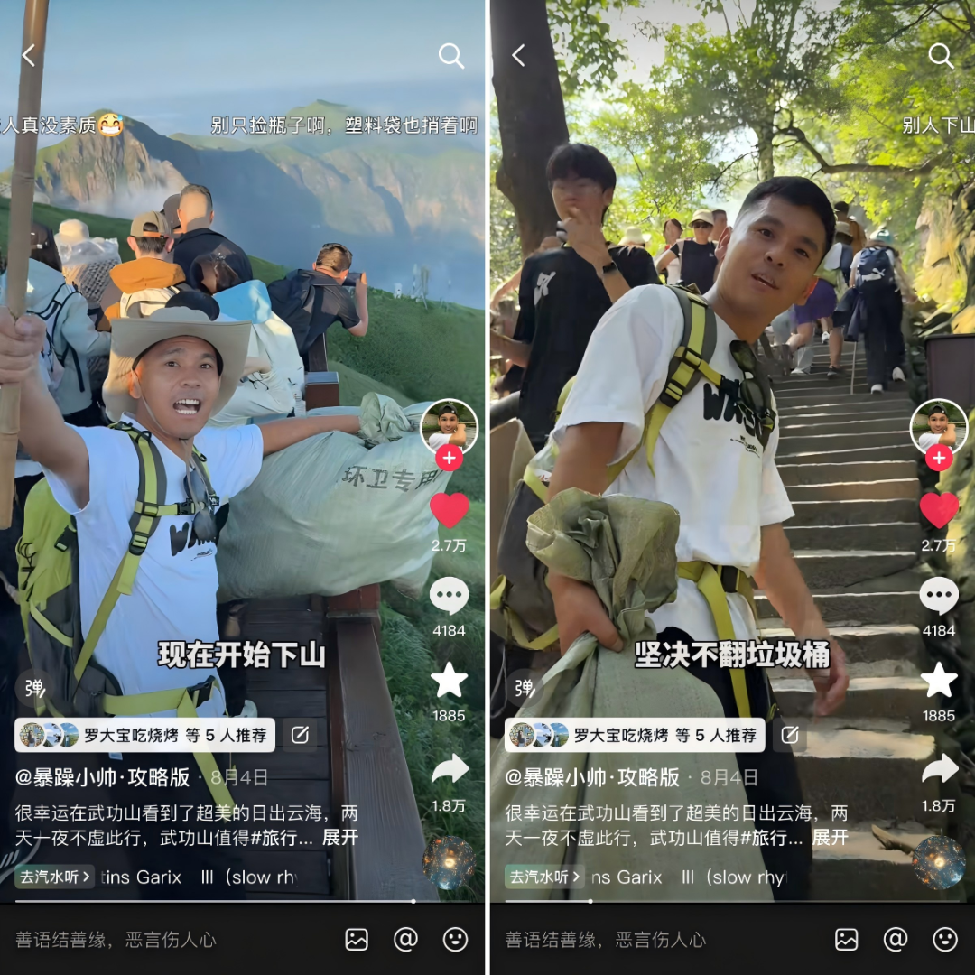 随着“绿色银行”的热度攀升,景区内的环保氛围愈发浓厚。来自赣州、上饶、广东的三位小伙子自发组成“捡瓶子小队”,一边登山一边捡拾饮料瓶子。石鼓寺广场上,一个装满饮料瓶子、矿泉水瓶子的编织袋旁,几名大学生正开心地合影留念:“这是我们今天的成果,感觉比拍风景照更有成就感!”
