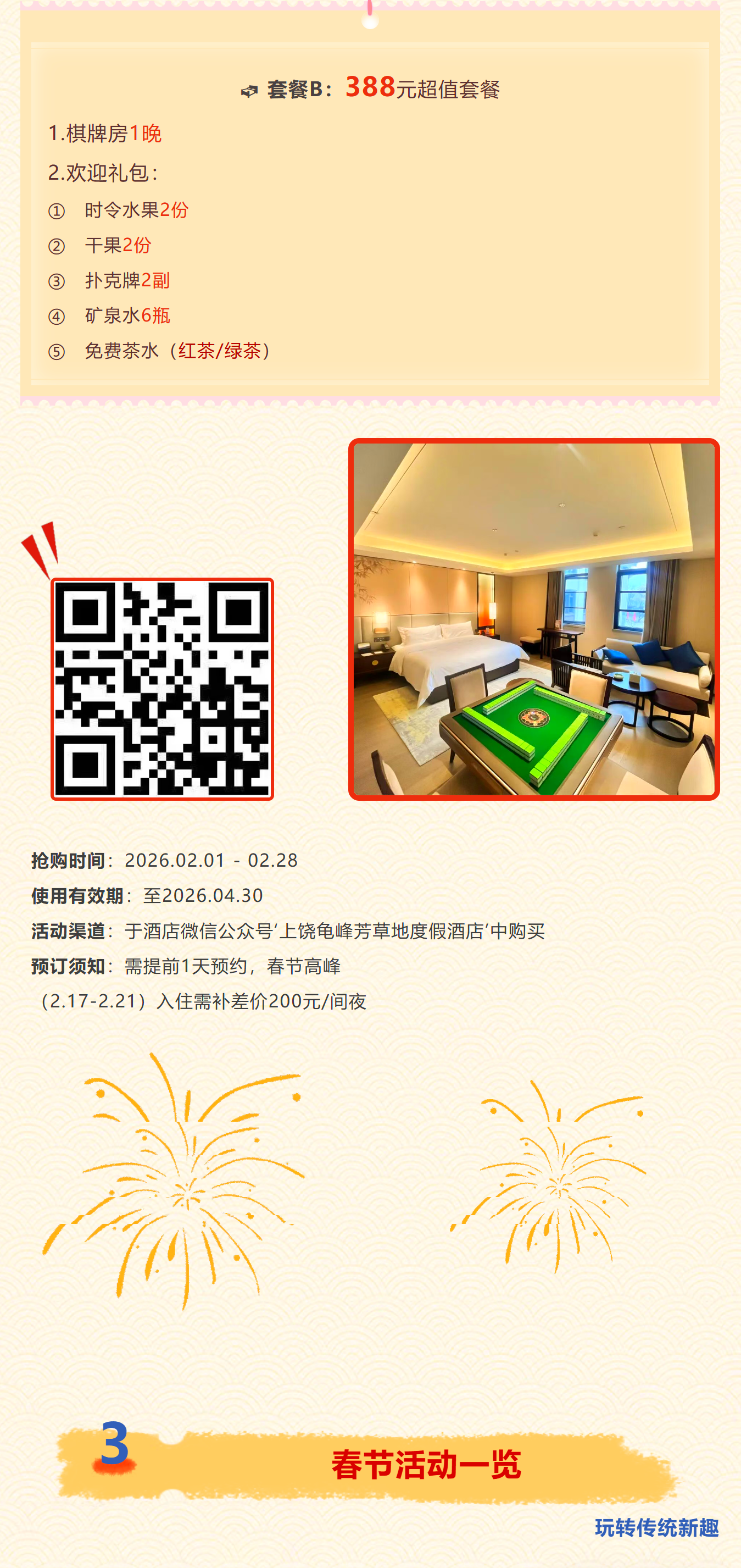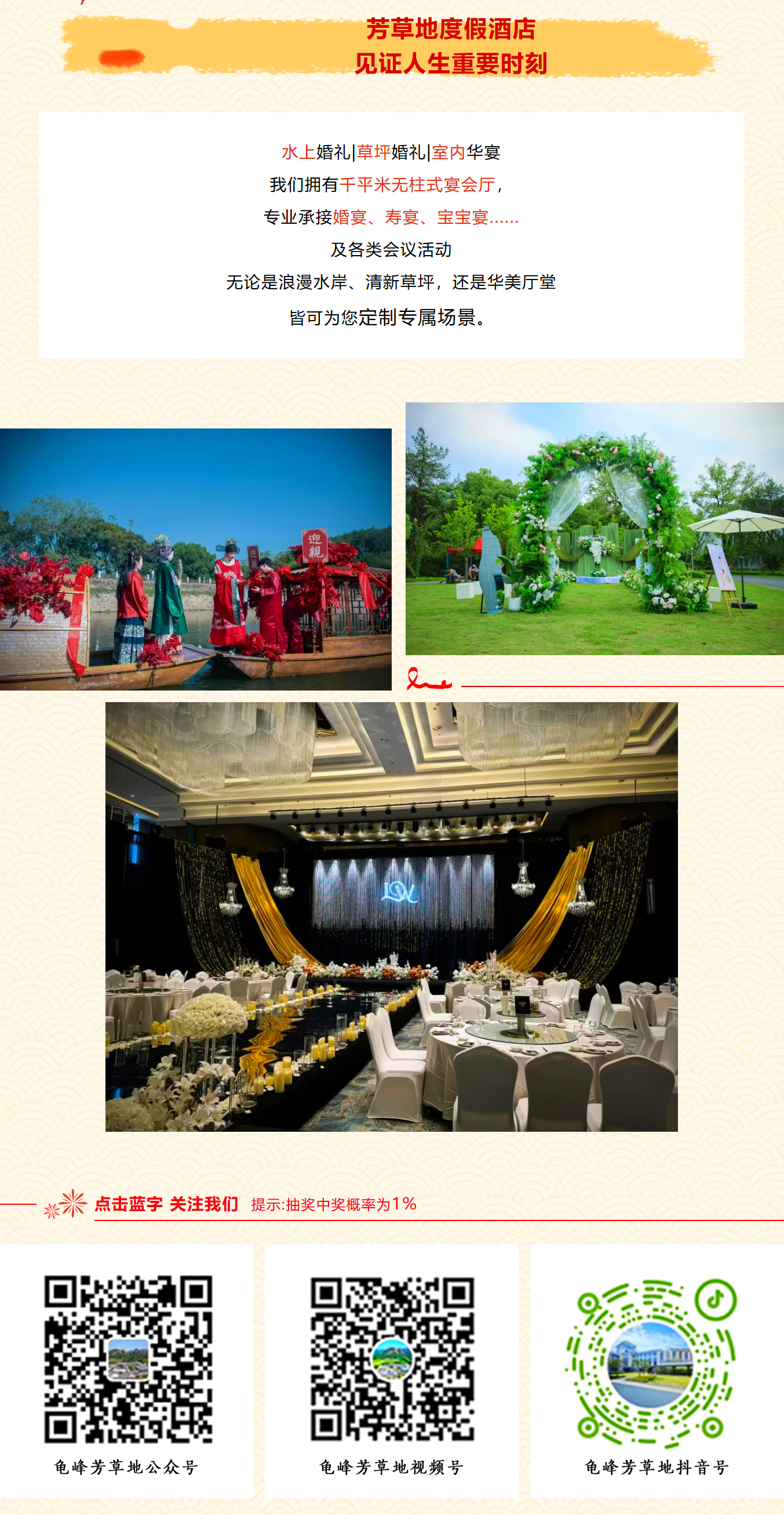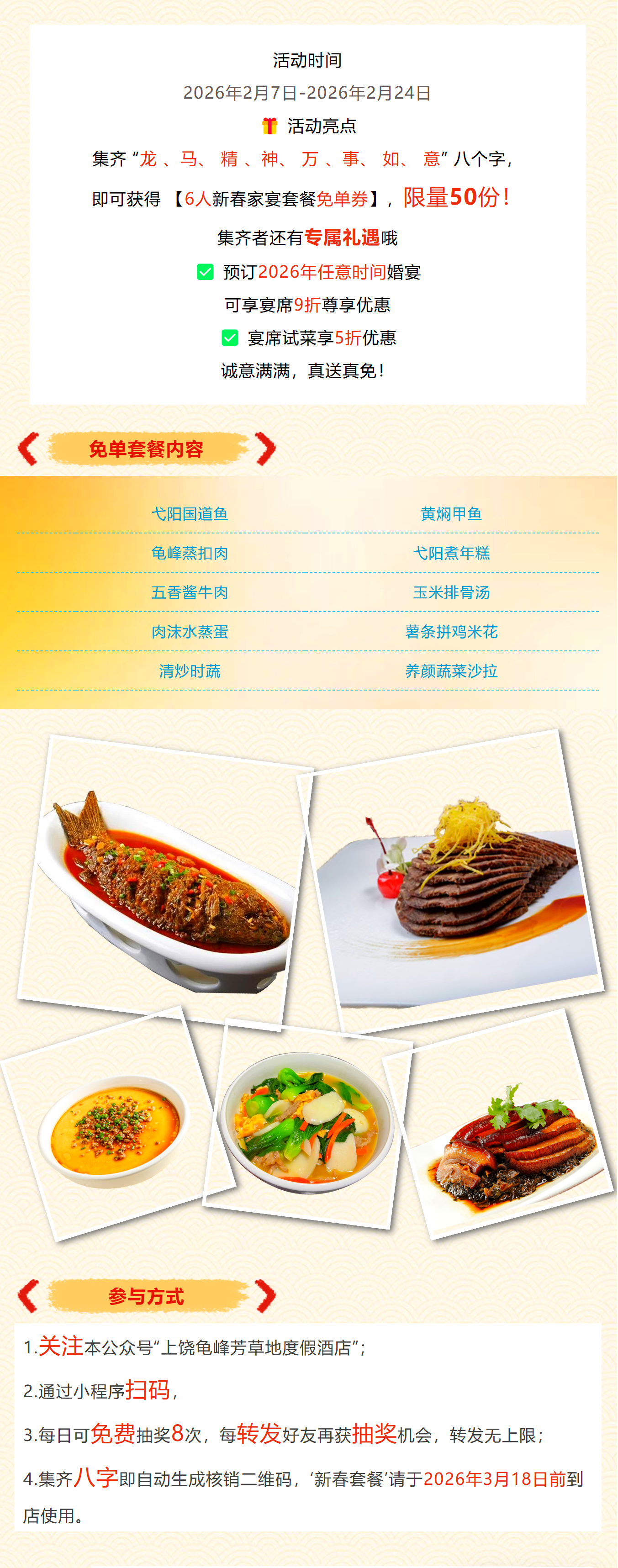 手慢无!龟峰芳草地新春攻略:抢6人免单宴,婚宴9折优惠! 龟峰景区 · 2026-02-07 21:13:44 分享到 打开微信“扫一扫”,打开网页后点击屏幕右上角分享按钮。 手慢无!龟峰芳草地新春攻略:抢6人免单宴,婚宴9折优惠! 来源|龟峰景区 龟峰景区 0