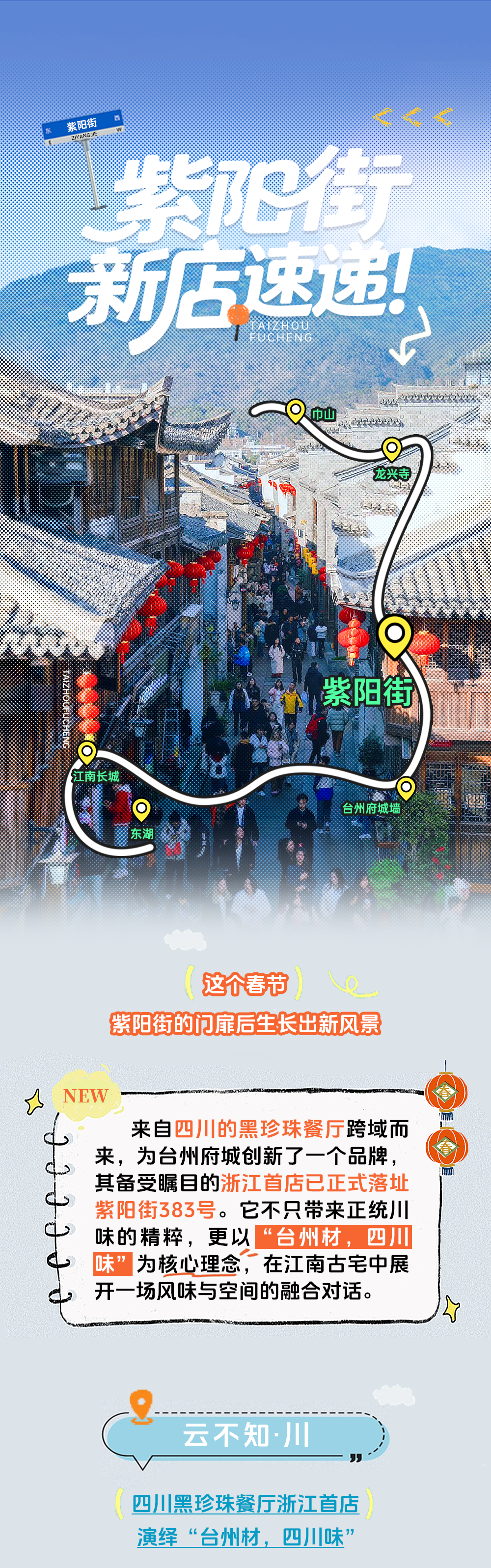 浙江首店|黑珍珠川菜为千年古城定制台州味道 台州府城 · 2026-02-28 13:49:12 分享到 打开微信“扫一扫”,打开网页后点击屏幕右上角分享按钮。 浙江首店|黑珍珠川菜为千年古城定制台州味道 以“川味入浙,古街烟火”为理念,在完整保留江南古建筑骨架的空间里,进行着一场风味的融合革新。其灵魂在于菜品:作为落地台州府城的浙江首店,它不以复刻为终点,而以 “用台州菜,做四川味” 为起点,完成风味的融合与创造。- 不乏惊艳的融合巧思 -最大的惊喜,或许在于菜单中那些“本地化”尝试。想象川式的香麻与临海小海鲜的邂逅,或是在传统味型中融入一丝本地食材的清甜。这种不拘一格的创意,让每一次点单都充满探索的乐趣。- 台州风物的川式表达 -一道「炝锅黄鱼」,便是“台州材,四川味”的绝佳诠释——精选台州本港鲜黄鱼,以四川经典的“炝锅”技法,在滚油热辣中瞬间激发出泼辣香气与鱼肉嫩滑,让东海之鲜与川味之魂在口中热烈相拥。- 古街氛围的沉浸体验 -在明清风格的老宅中,享用这样一顿融合盛宴,窗外是慢生活街景,窗内是沸腾江湖气,时空与味觉在此刻交错。在紫阳街151-155号区域,「于塗·甜狒狒」系列以“轻中式”设计,清爽时髦地重新诠释街头小吃,带来烟肉卷冰淇淋、糖油果子、手酿酸奶豆花等创意选择。- 糖油果子 -让成都的市井美味,以更灵动的姿态融入古街肌理。现场制作的过程充满观赏性,除了经典红糖芝麻味,更有坚果碎、海苔芝麻等创新口味,堪称“老味新作,市井雅食”。该系列店铺同样注重设计,提取中式建筑骨架,用通透格栅与素雅材质,打造出清爽、时髦的“轻中式”空间,彻底刷新你对传统小吃店的印象。- 肯德基轻食 -全球快餐巨头也带来了更符合健康趋势的轻食选择,为游客和本地居民提供了快速、轻负担的能量补给站。- 青年慢闪计划 -一些短期出现的创意店铺或艺术摊位,如同彩蛋般散落街巷,每次相遇都是惊喜,持续为古街输送年轻活力。来源|台州府城 台州府城 0