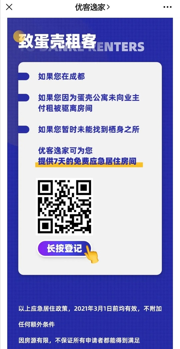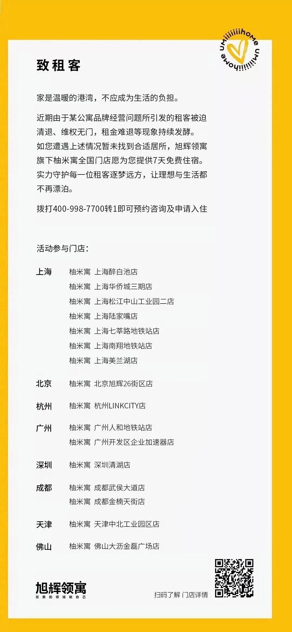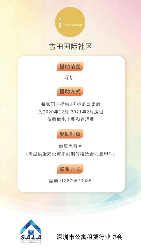深圳市公寓租赁行业协会展开“援助蛋壳租客,公寓人在行动”活动,吉田国际社区、栖息地青年公寓、荔枝公寓、落脚地公寓、暖寓、睡窝公寓、燕寓社区、西柚小镇、喔寓·青年公寓、和院轻奢公寓、粤鹏湾公寓,等品牌公寓援助租客。