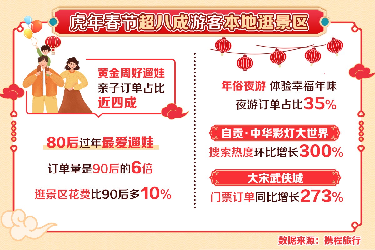 2月6日,携程发布的《2022年春节旅游总结报告》显示:虎年春节,超八成游客选择在本地逛景区,本省景区门票占比高达82%。值得一提的是,今年春节亲子订单占比近四成,亲子家庭逛景区的花费相较非亲子的订单花费多31%。其中,80后最爱过年期间“遛娃”,80后带娃的订单是90后带娃的6倍,80后带娃逛景区的花费比90后多10%。