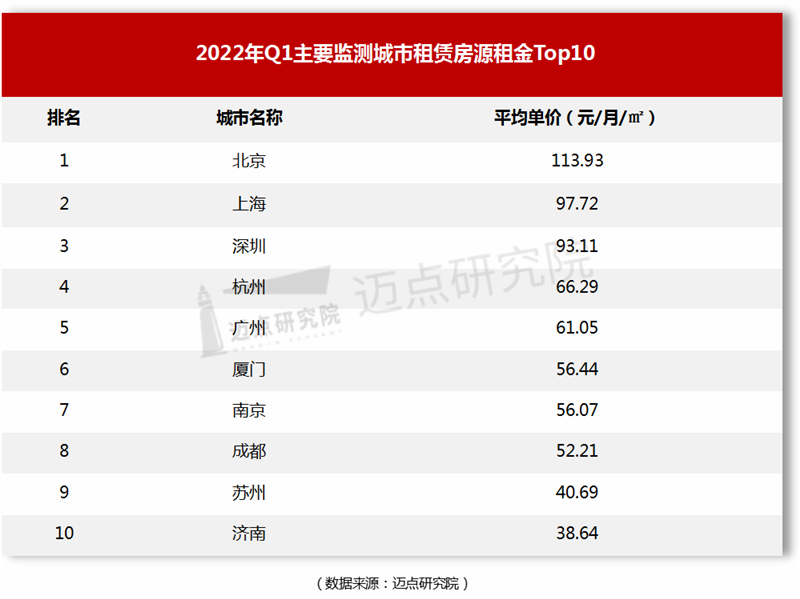 4月27日,迈点研究院发布了《2022年第一季度住房租赁市场报告》。报告指出,今年第一季度,全国主要监测的20城住房租赁市场的租金整体呈现下降趋势。在主要监测城市租赁房源租金TOP10 榜单中,北京位居第一。