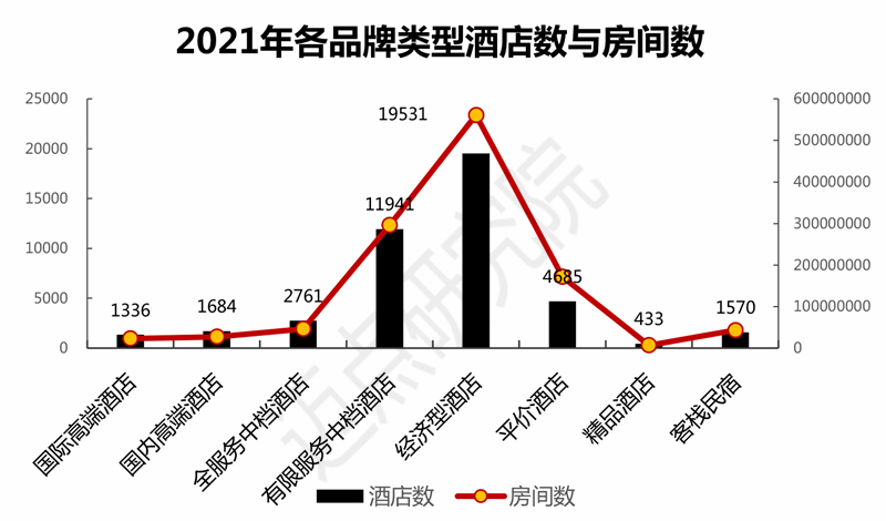 6月30日,迈点研究院独家发布《2021-2022旅游住宿业品牌发展规模》显示,2021年,高端品牌酒店连锁客房数为5017.75万间,酒店数为3020个;中档品牌酒店客房数为342225.26万间,酒店数为14702个;经济连锁品牌酒店客房数为73229.20万间,酒店数为24216个;非标住宿品牌酒店客房数为4963.68万间,酒店数为2003个。