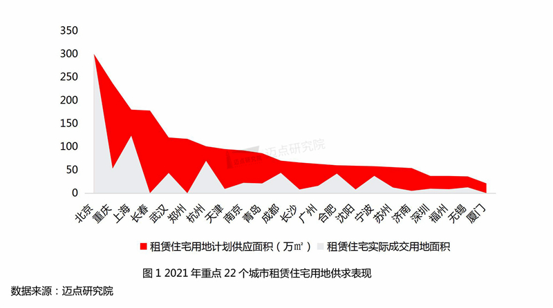 7月4日,迈点研究院独家发布《2021-2022年中国住房租赁行业发展之“土地篇、融资篇”》,数据显示截止至2021年底,22城实际成交租赁住宅用地845.98万㎡,完成了既定目标的40%。