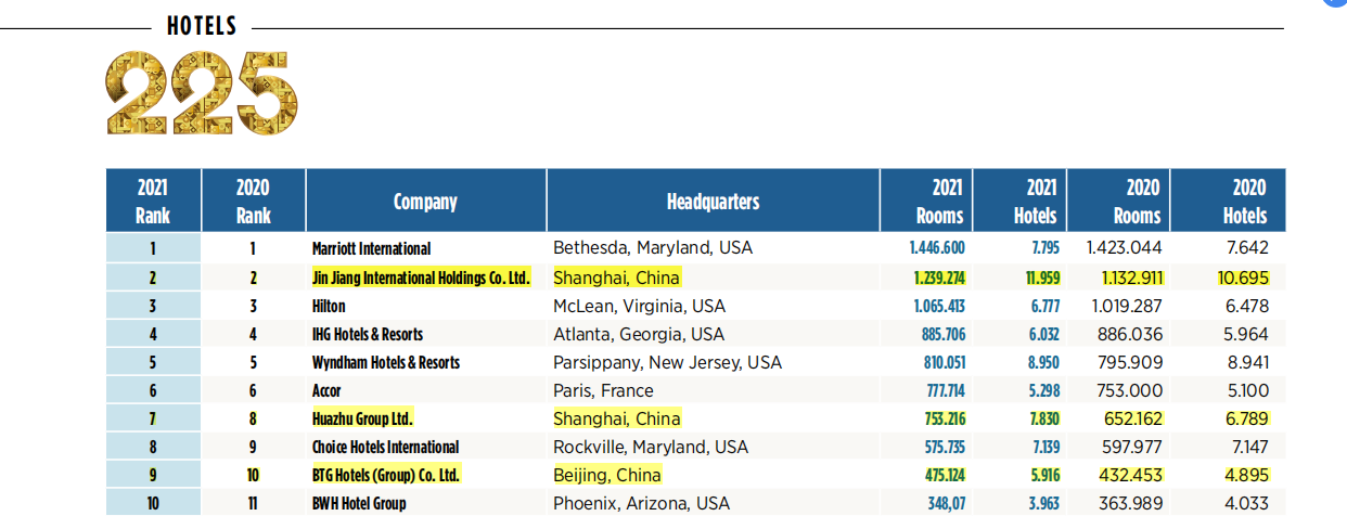 美国时间7月6日,酒店业国际权威杂志《HOTELS》公布2021年度“全球酒店集团225强” (HOTELS 225)排名。中国共有33个酒店集团入围榜单,21个酒店集团相较2020年排名有所上升锦江国际集团、华住集团、首旅如家酒店集团入围前十。