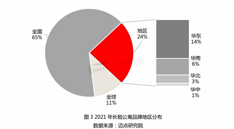 7月22日,迈点研究院独家发布《2021-2022年中国住房租赁行业“品牌发展篇”》数据,显示截止到2021年底,当前长租公寓MBI品牌指数TOP 100的品牌中,超过七成的长租公寓品牌已展开全球和全国布局,剩下的主要分布在华东地区和华南地区。相比2020年,华东地区品牌数量增加最为明显,占比提升了4%。