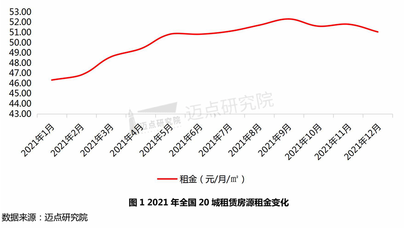 7月27日,迈点研究院独家发布《2021-2022年中国住房租赁行业“城市篇”》,数据显示2021年租赁市场回归传统周期,市场热度持续上升,尤其是受到春节后、毕业季、开学季等租赁旺季影响,租赁市场要比上年同期火热。从租金水平来看,全国重点监测20城市平均月租金为50.21元/㎡,同比2020年小幅上涨。