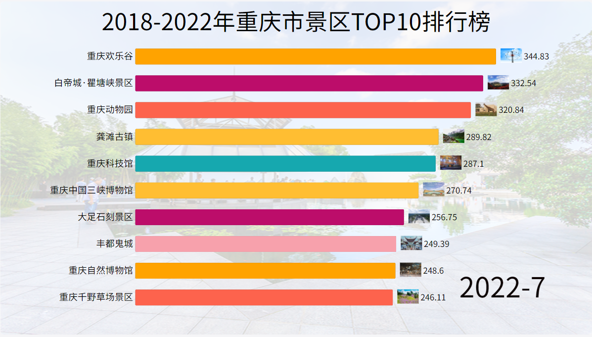 迈点研究院独家发布的《2018-2022年重庆市景区TOP10》榜单显示,重庆欢乐谷、白帝城·瞿塘峡景区、重庆动物园位列7月前三。