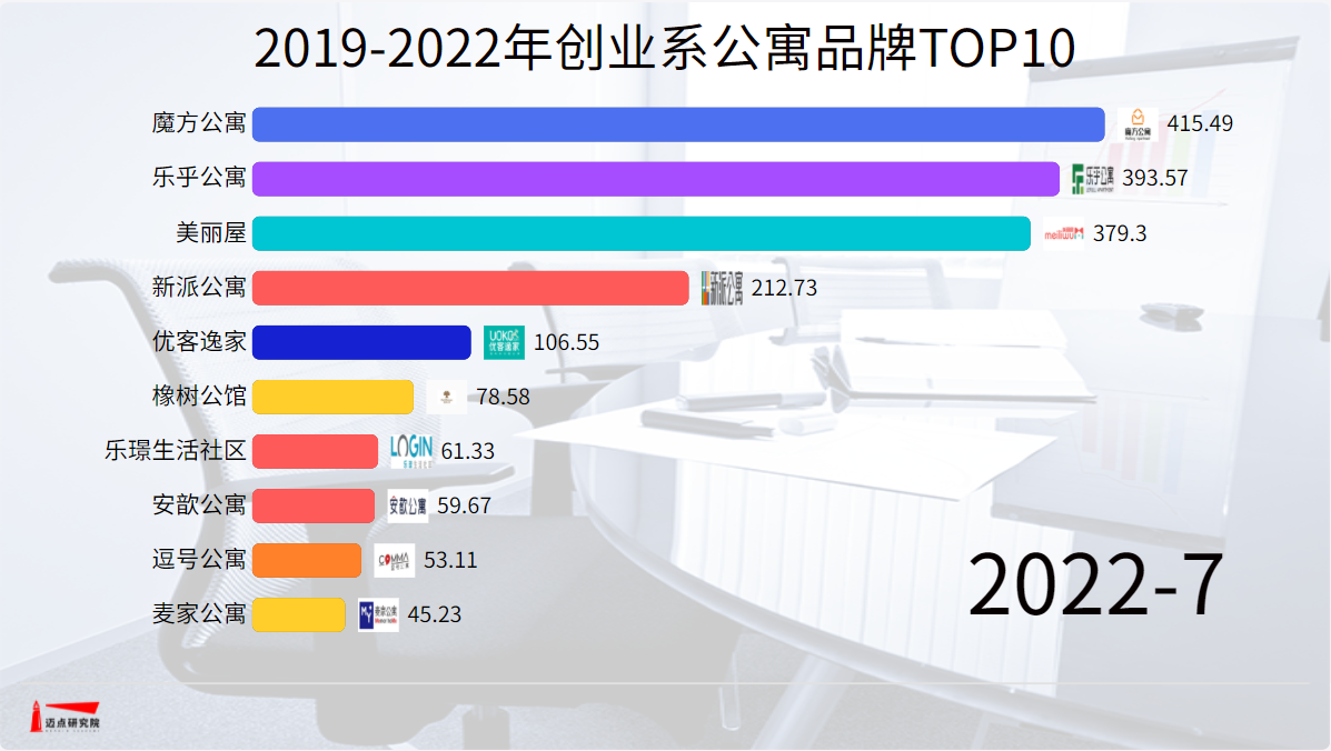 迈点研究院独家发布的《2019-2022年创业系公寓品牌TOP10》榜单显示,魔方公寓、乐乎公寓、美丽屋位列2022年7月前三甲。