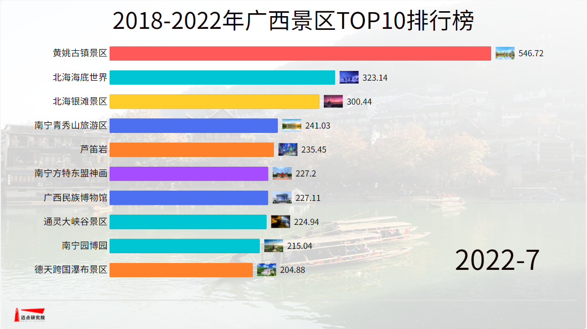 8月25日,迈点研究院独家发布《2018-2022年广西景区TOP10排行榜》,其中黄姚古镇景区、北海海底世界、北海银滩景区位列2022年7月前三。