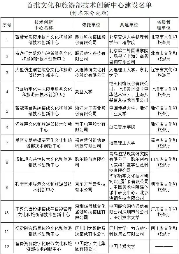 8月1日,文化和旅游部发布《关于首批文化和旅游部技术创新中心建设名单的公示》,公示内容如下: