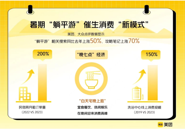 美团、大众点评数据显示,暑期以来,“躺平游”相关搜索比去年同期上涨50%,攻略笔记同比上涨70%。搜索人群中,30岁以下年轻人占比超过七成。这一新趋势也带动了洗浴中心线上消费规模较2019年增长150%、按周或月预订的民宿订单量同比去年涨超200%,并催生了“晚七点”经济,促进堂食餐饮、休闲娱乐等业态在晚间迎来全天订单最高峰。