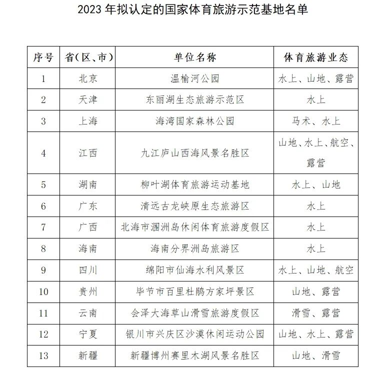 近日,根据《体育总局办公厅 文化和旅游部办公厅关于开展2023年国家体育旅游示范基地申报工作的通知》(体经字〔2023〕123号),在各省(区、市)体育行政部门、文化和旅游厅(局)推荐申报基础上,体育总局、文化和旅游部组织专家评审和现场评估,拟将北京温榆河公园等13家单位认定为国家体育旅游示范基地,现予以公示。