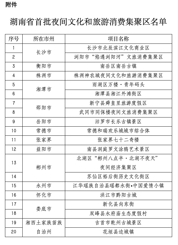 近日,湖南省文化和旅游厅发布通知,确定了20家湖南省首批夜间文化和旅游消费集聚区的名单,现予以公布。