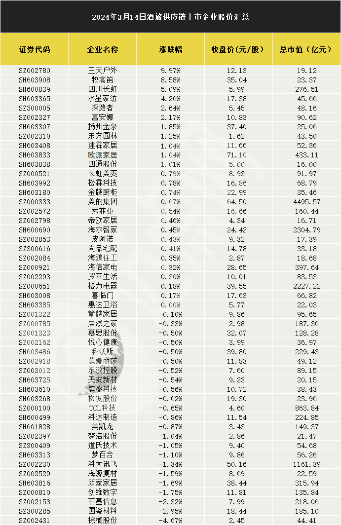 酒旅供应链个股方面,三夫户外(SZ:002780)午后涨停,牧高笛(SH:603908)涨超8%,四川长虹(SH:600839)涨超5%,水星家纺(SH:603365)涨超4%。