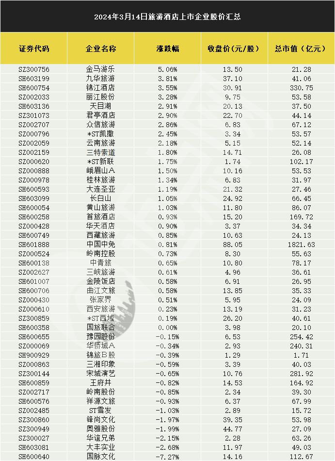 旅游酒店个股方面,金马游乐(SZ:300756)涨超5%,九华旅游(SH:603199)、锦江酒店(SH:600754)、丽江股份(SZ:002033)涨超3%。