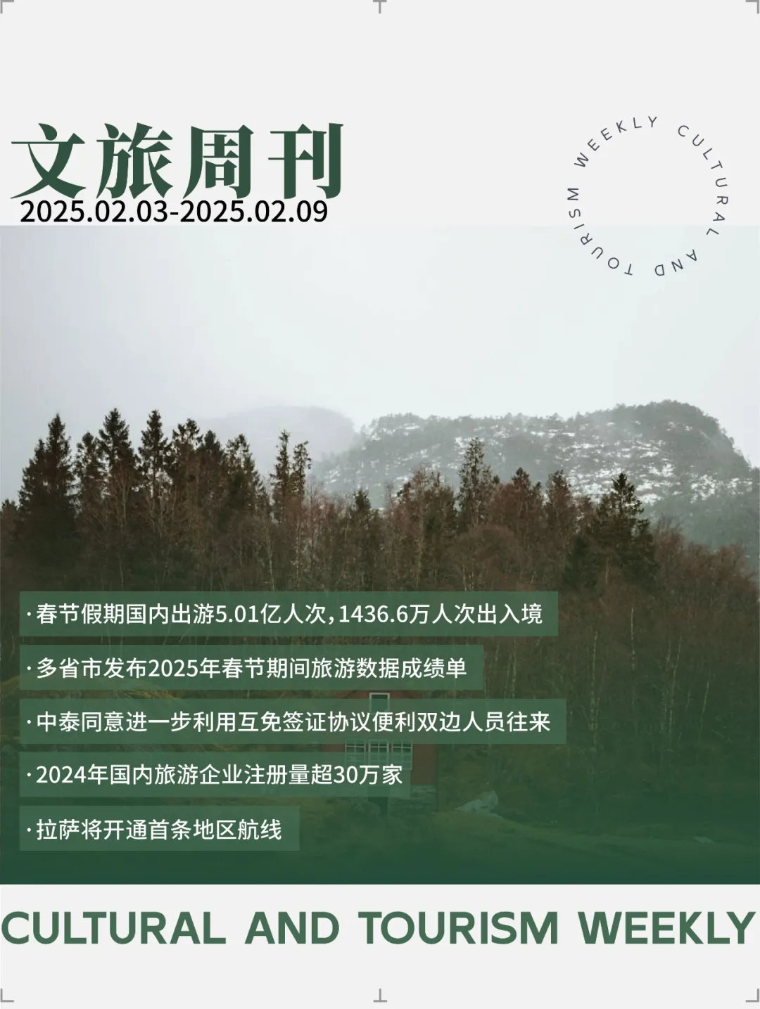 春节国内出游5.01亿人次,出入境1436.6万人次;2024年国内旅游企业注册量超30万家|文旅周刊