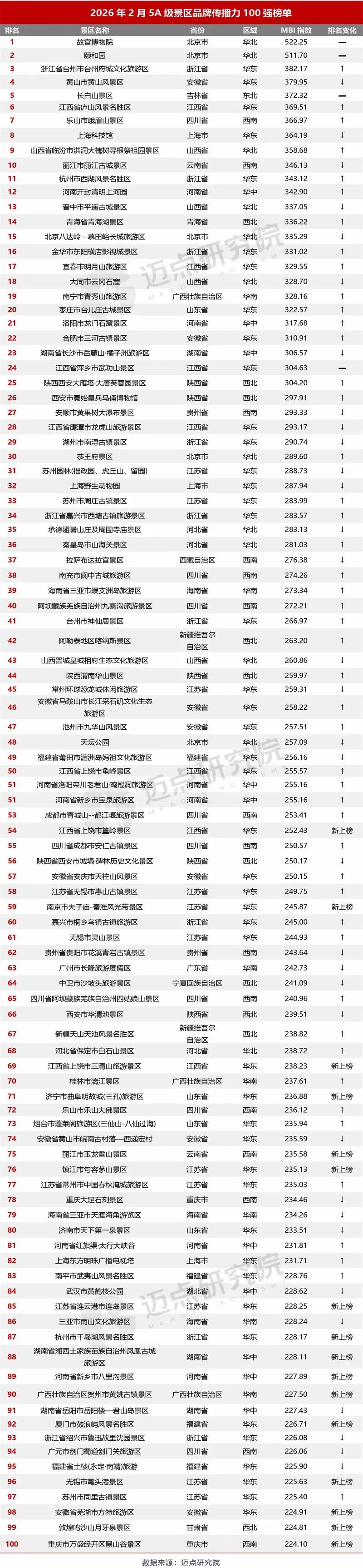 2026年2月5A级景区品牌传播力100强榜单