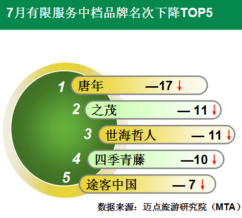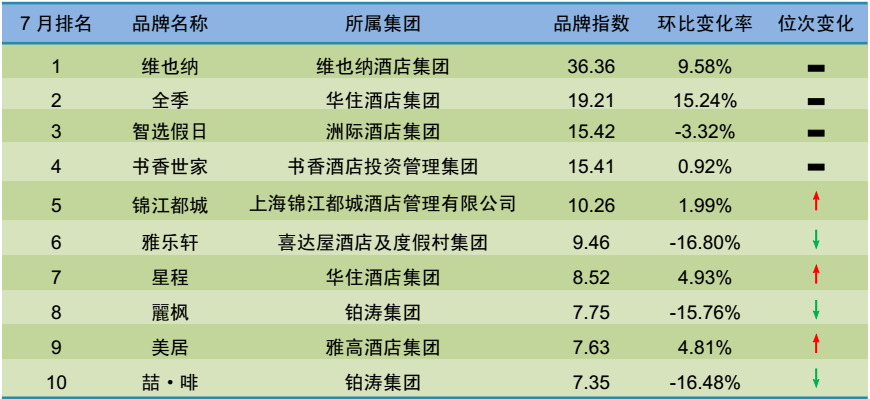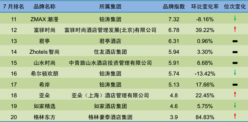 (2)从排名变化看,7月份名次上升的品牌有21家,名次下降和持平的有限服务中档酒店品牌分别为33家和11家。