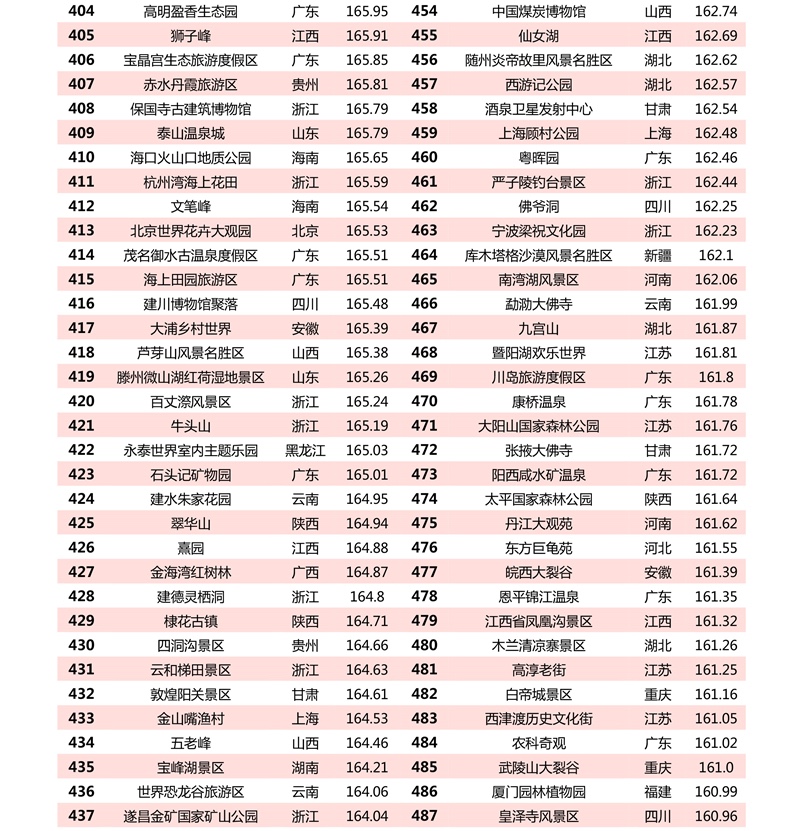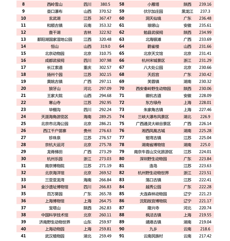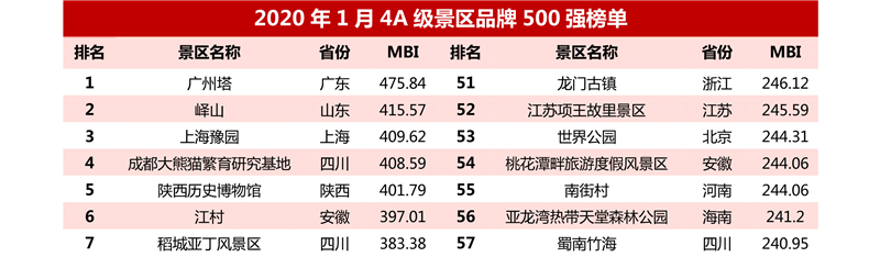 在本月迈点研究院最新发布的“2020年1月4A级景区品牌500强榜单”中,广州塔、峄山、上海豫园、成都大熊猫繁育研究基地、陕西历史博物馆、江村、稻城亚丁风景区、西岭雪山、壶口瀑布、玄武湖位列TOP10。具体榜单如下: