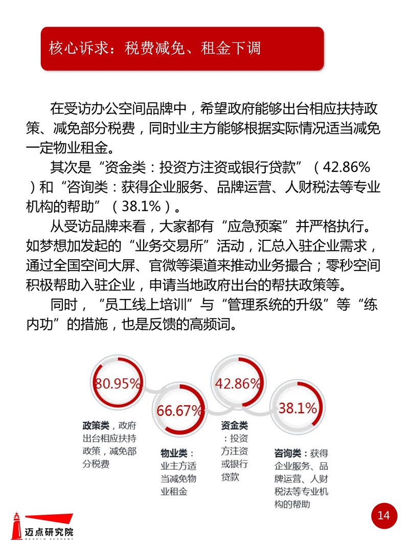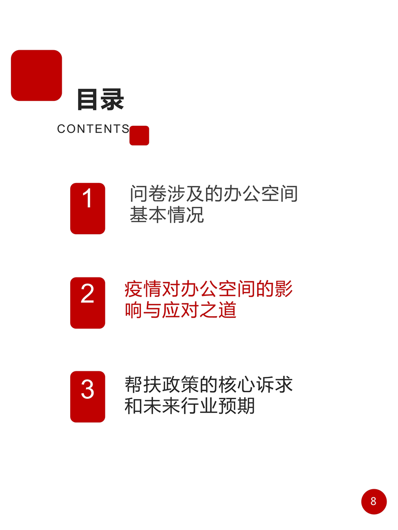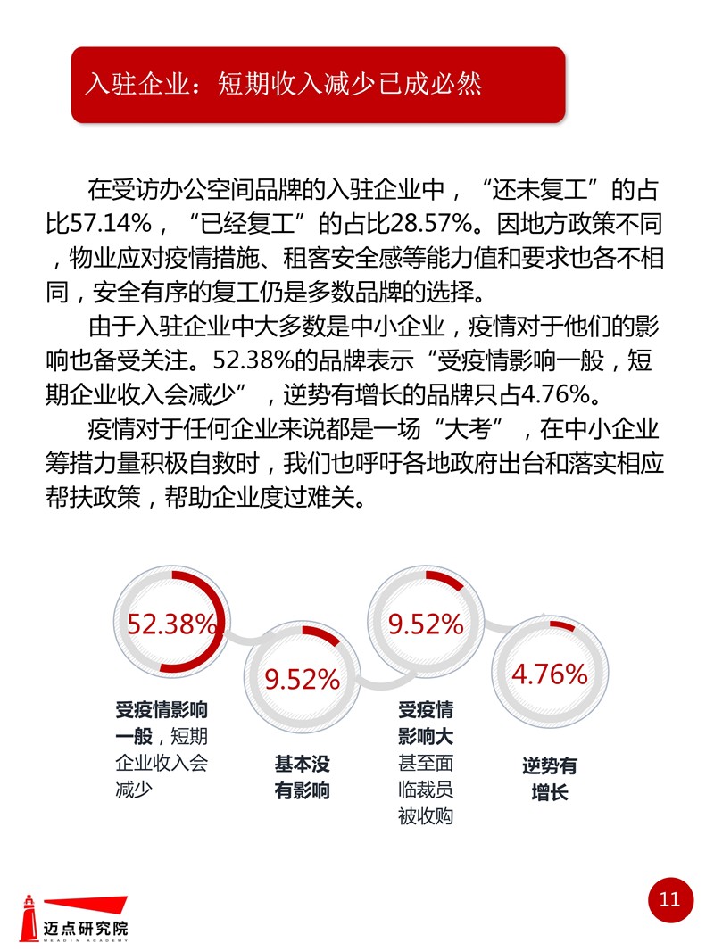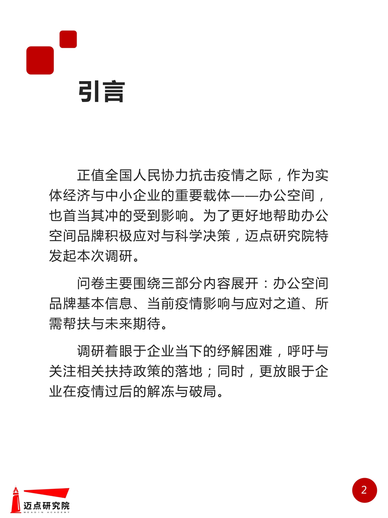 2020中国办公行业疫情应对及诉求分析报告 迈点研究院 · 徐艺文 · 2020-02-27 09:00:00 分享到 打开微信“扫一扫”,打开网页后点击屏幕右上角分享按钮。 调研着眼于企业当下的纾解困难,呼吁与关注相关扶持政策的落地;同时,更放眼于企业在疫情过后的解冻与破局。 办公空间 办公 调查报告 9