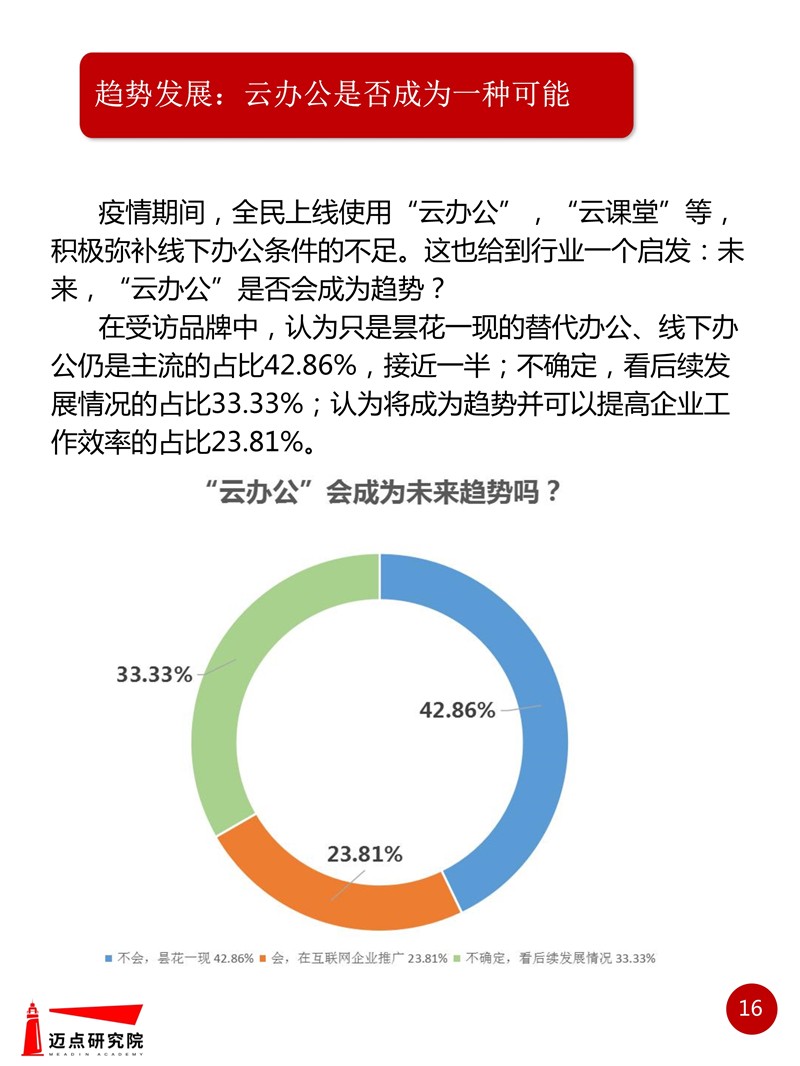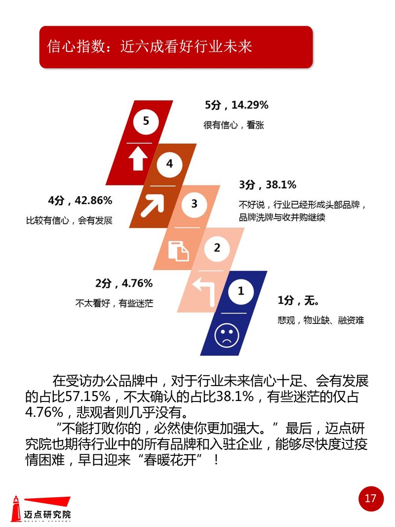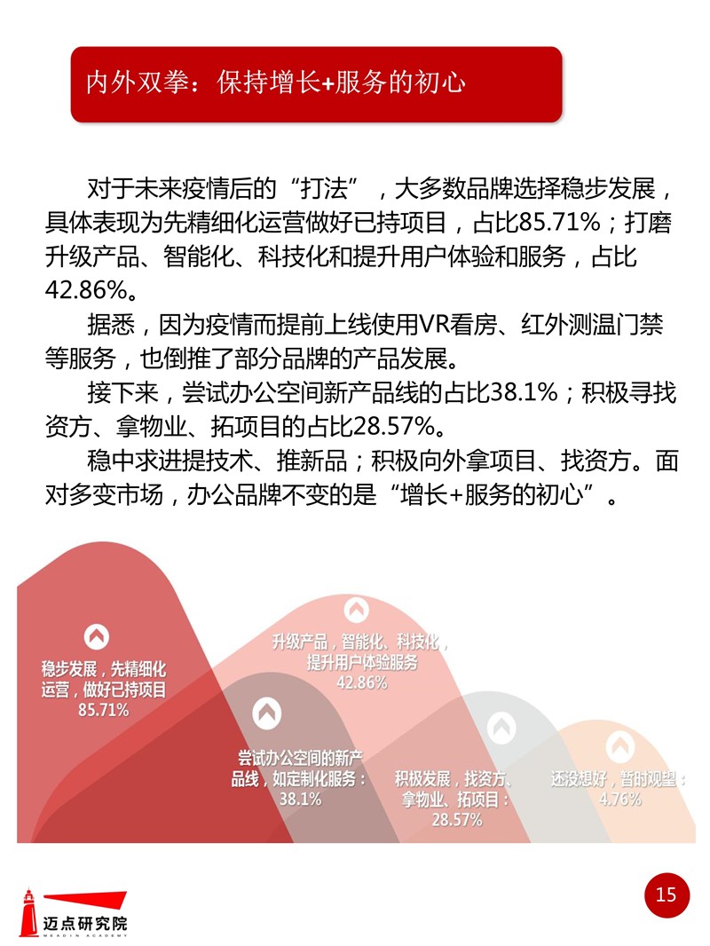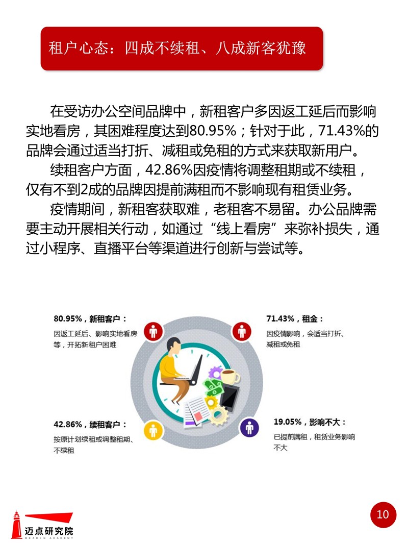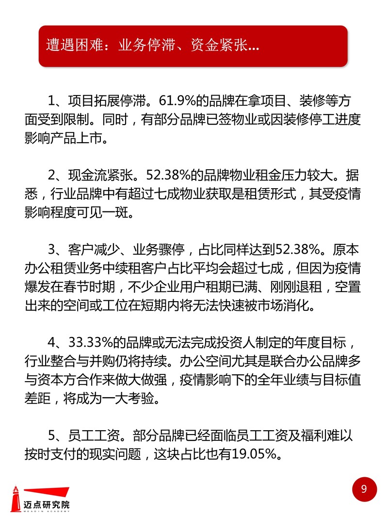 2020中国办公行业疫情应对及诉求分析报告 迈点研究院 · 徐艺文 · 2020-02-27 09:00:00 分享到 打开微信“扫一扫”,打开网页后点击屏幕右上角分享按钮。 调研着眼于企业当下的纾解困难,呼吁与关注相关扶持政策的落地;同时,更放眼于企业在疫情过后的解冻与破局。 办公空间 办公 调查报告 9