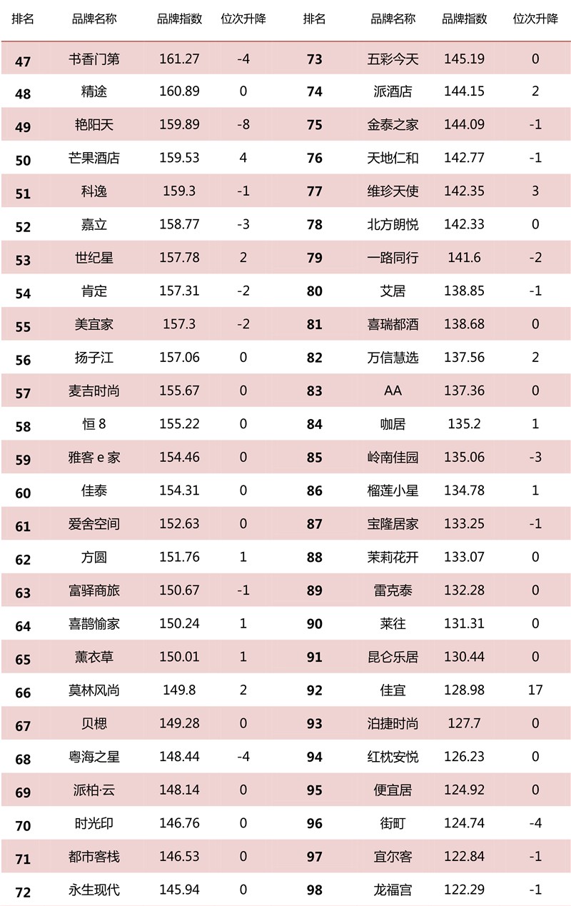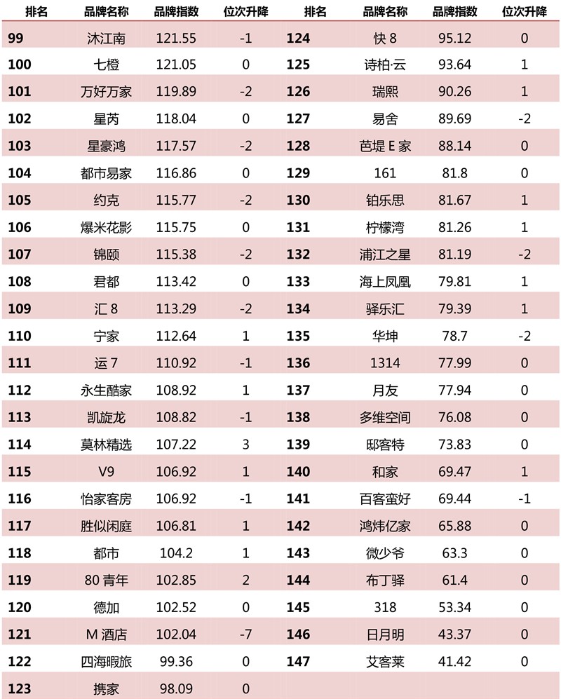 榜单内共计147经济型酒店品牌和32家平价酒店品牌。品牌影响力上,11.73%环比上升;分别来看,14.29%的经济型酒店品牌环比上升,0.00%的平价酒店品牌环比上升。品牌排名上,32.40%的品牌较上月环比上涨;分别来看,32.65%的经济型酒店品牌环比上涨,31.25%的平价酒店品牌环比上涨,竞争过程中彼此的差距相对明显。具体榜单如下: