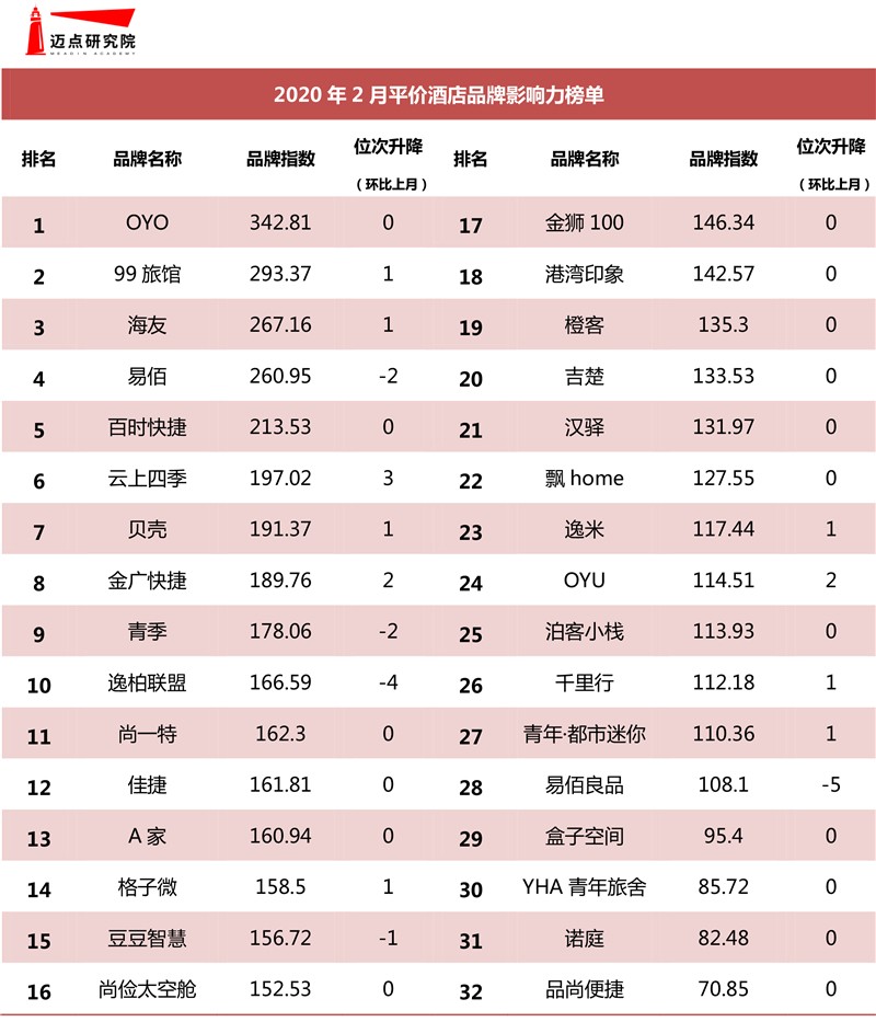 本月迈点研究院最新独家发布的“2020年2月中国住宿业经济型/平价酒店品牌影响力榜单”中,如家、锦江之星、汉庭、速8、7天、格林豪泰、布丁、怡莱、城市便捷和尚客优成为经济型酒店品牌TOP10;平价酒店品牌前十名则分别是OYO、99旅馆、海友、易佰、百时快捷、云上四季、贝壳、金广快捷、青季和逸柏联盟。