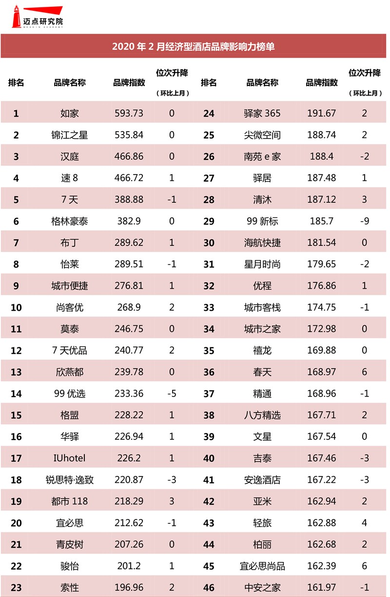 “2020年2月经济型/平价酒店品牌影响力榜单”数据来源于迈点品牌指数MBI,根据2月迈点品牌指数MBI 八大旅游住宿业品牌类目中的847家品牌数据汇总统计而成。具体说明如下: