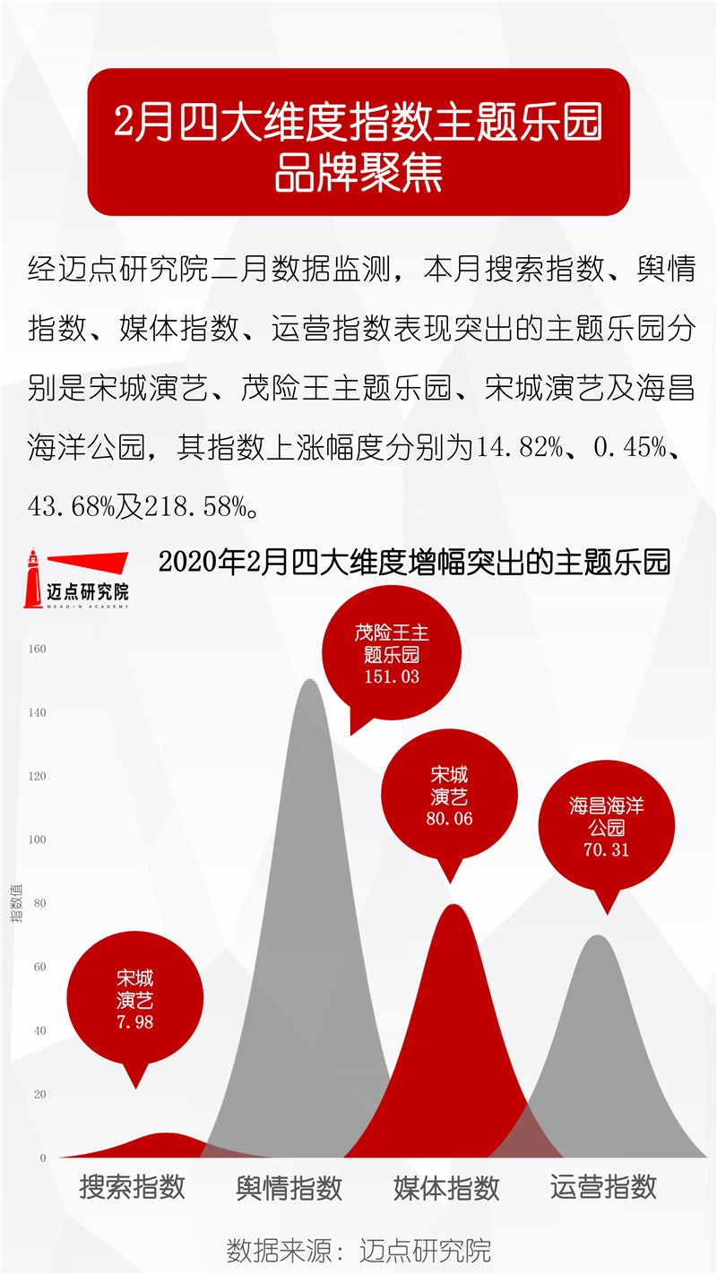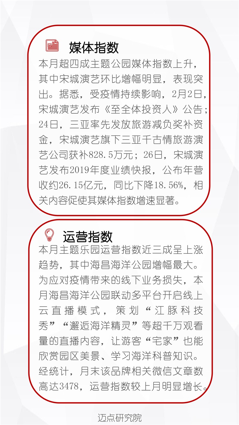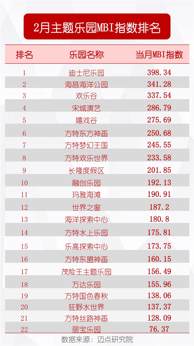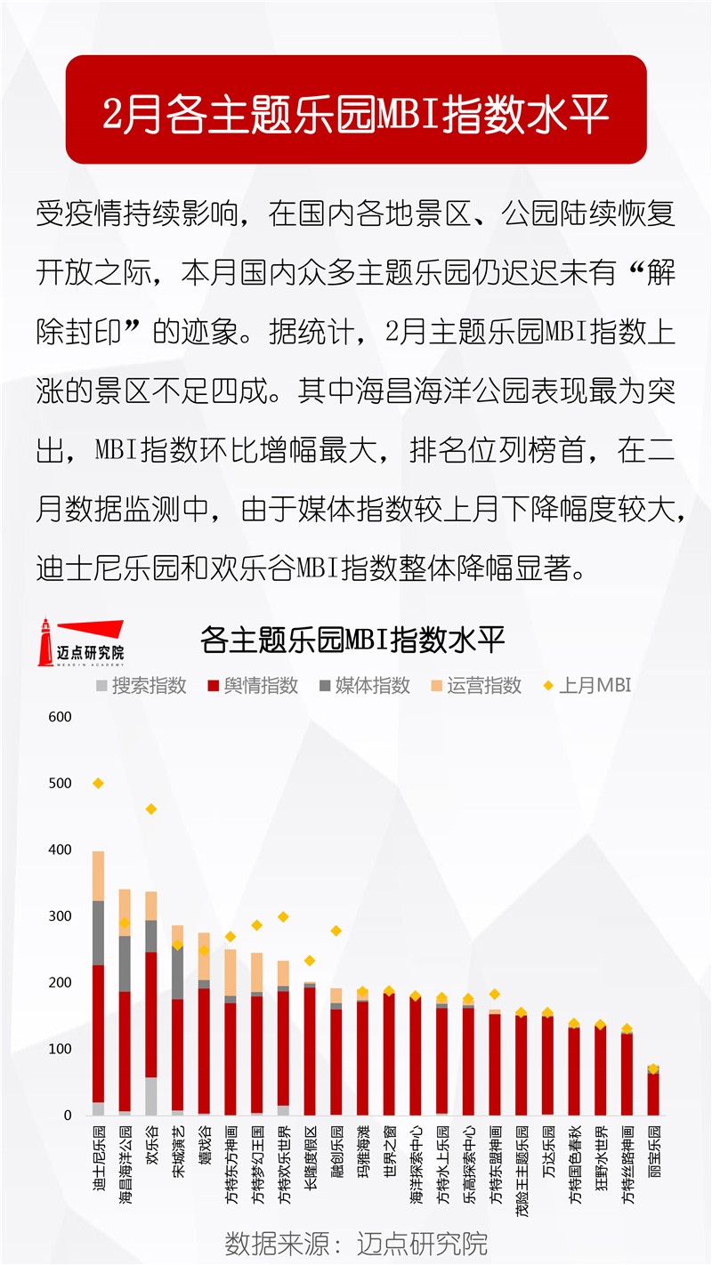 2020年2月主题乐园品牌发展报告 迈点研究院 · 张迪 · 2020-03-27 08:00:04 分享到 打开微信“扫一扫”,打开网页后点击屏幕右上角分享按钮。 受疫情持续影响,在国内各地景区、公园陆续恢复开放之际,本月国内众多主题乐园仍迟迟未有“解除封印”的迹象。据统计,2月主题乐园MBI指数上涨的景区不足四成 主题乐园 行业报告 数据 2