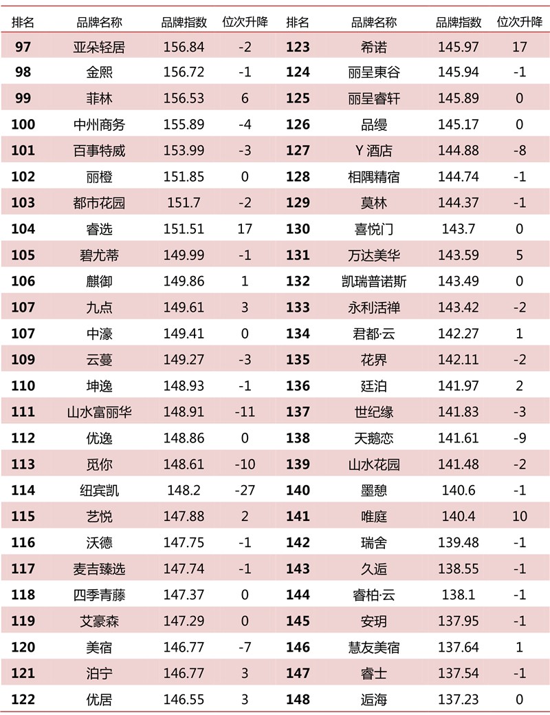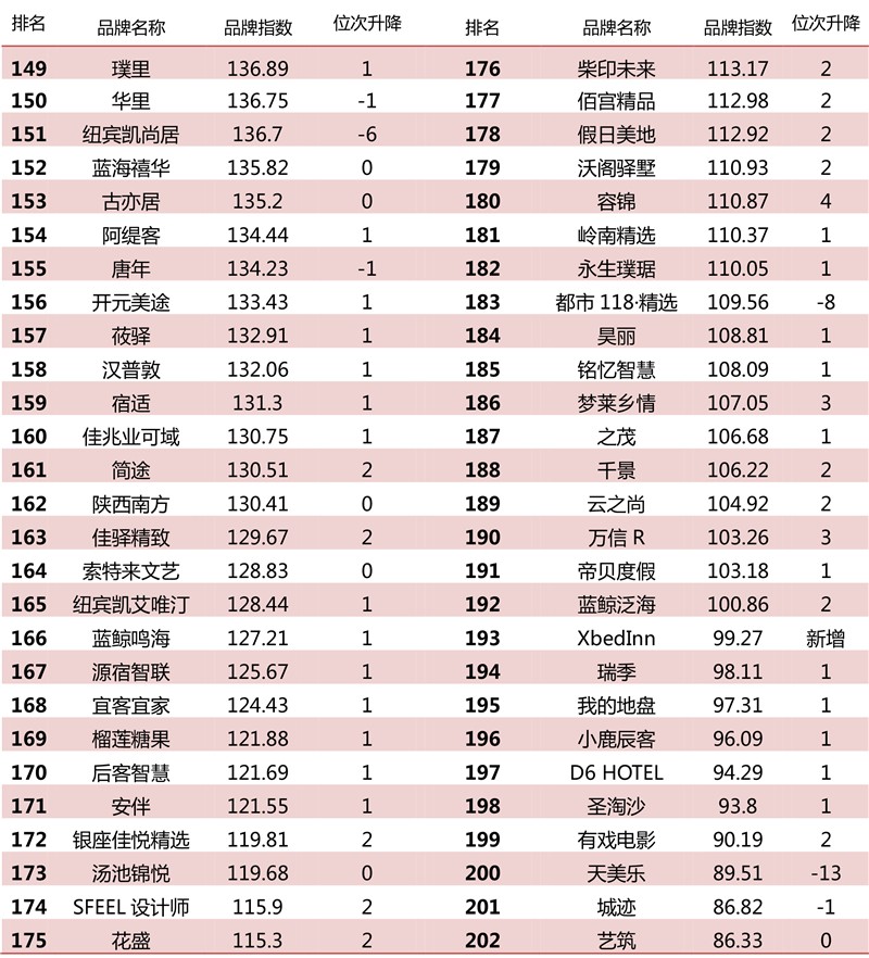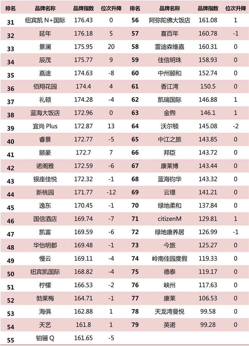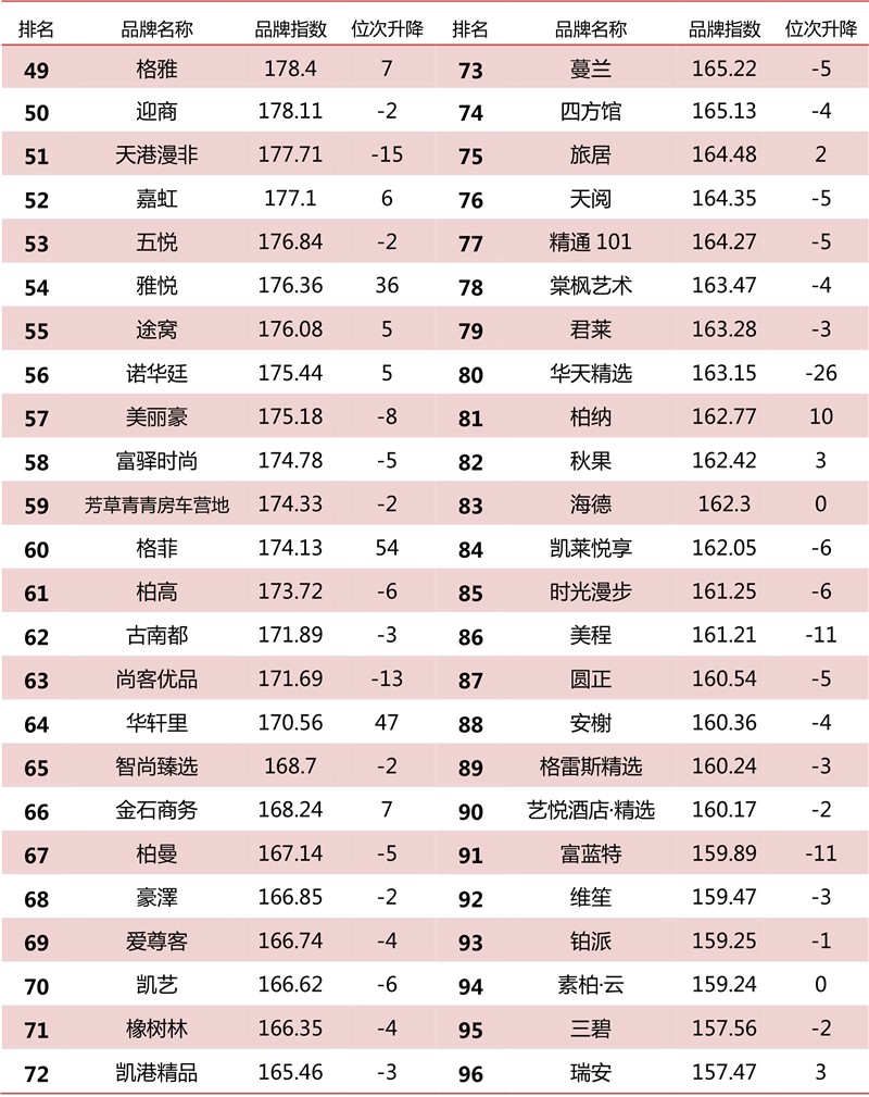 榜单内共计79家全服务中档酒店品牌和214家有限服务中档酒店品牌。品牌影响力上,55.29%的品牌较上月环比上涨;分别来看,55.70%的全服务中档酒店品牌环比上涨,55.14%的有限服务中档酒店品牌环比上涨。品牌排名上,37.88%的品牌环比上升;分别来看,31.65%的全服务中档酒店品牌环比上升,40.19%的有限服务中档酒店品牌环比上升。具体榜单如下: