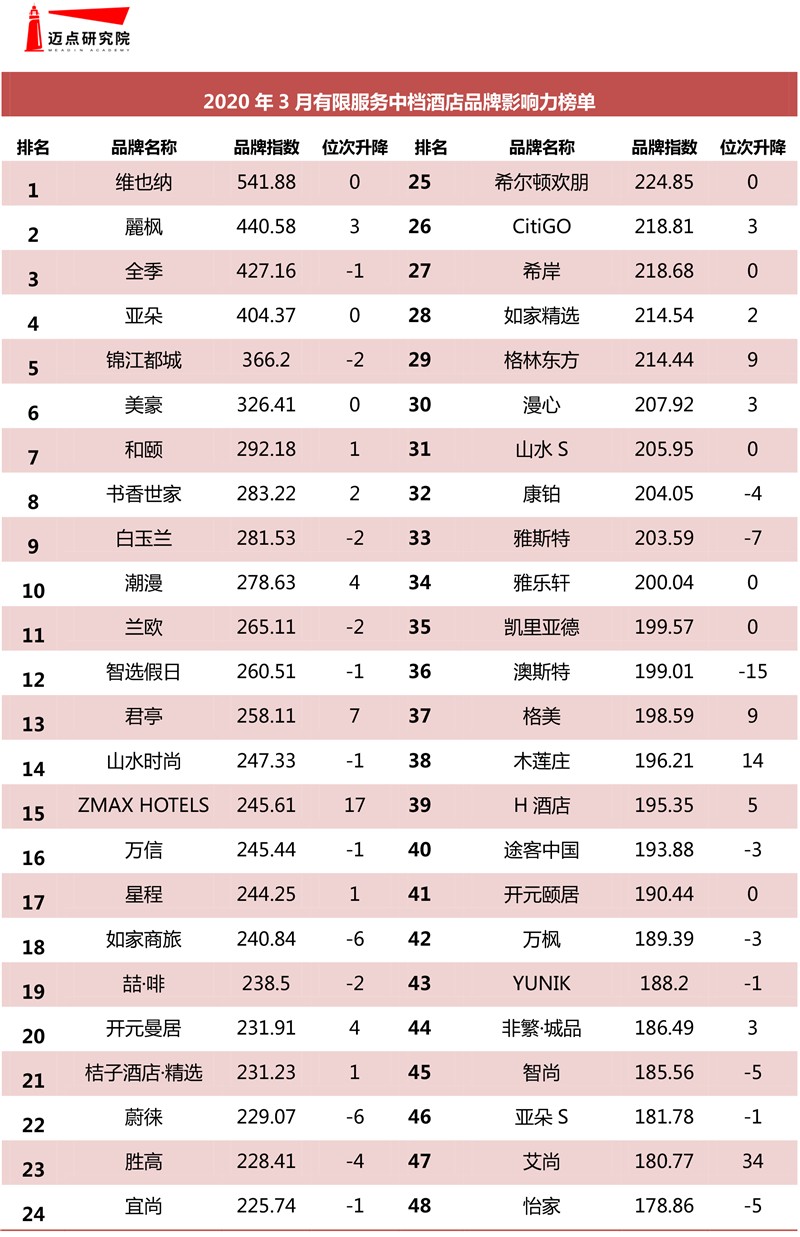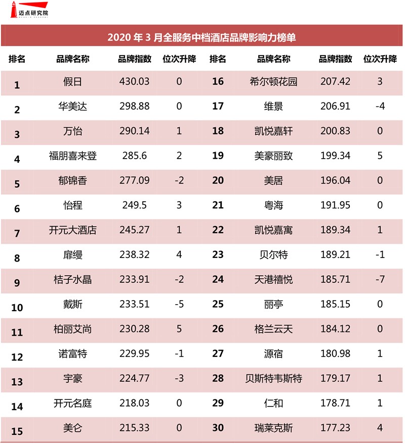 本月迈点研究院最新独家发布的“2020年3月中国住宿业全服务中档/有限服务中档酒店品牌影响力榜单”中,假日、华美达、万怡、福朋喜来登、郁锦香、怡程、开元大酒店、扉缦、桔子水晶和戴斯成为全服务中档酒店品牌TOP10;有限服务中档酒店品牌前十名则分别是维也纳、麗枫、全季、亚朵、锦江都城、美豪、和颐、书香世家、白玉兰和潮漫。