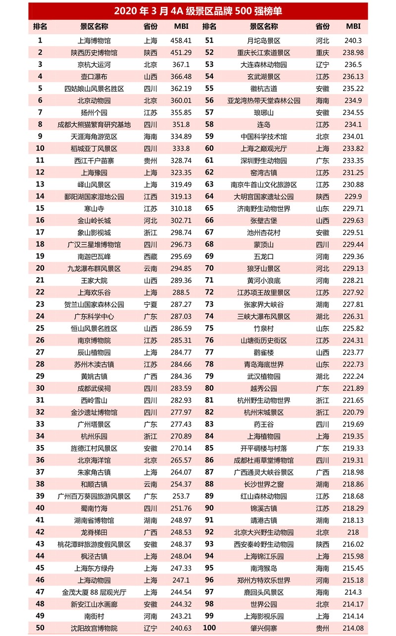 在本月迈点研究院最新发布的“2020年3月4A级景区品牌500强榜单”中,上海博物馆、陕西历史博物馆、京杭大运河、壶口瀑布、四姑娘山风景名胜区、北京动物园、扬州个园、成都大熊猫繁育研究基地、天涯海角游览区、稻城亚丁风景区位列TOP10。具体榜单如下: