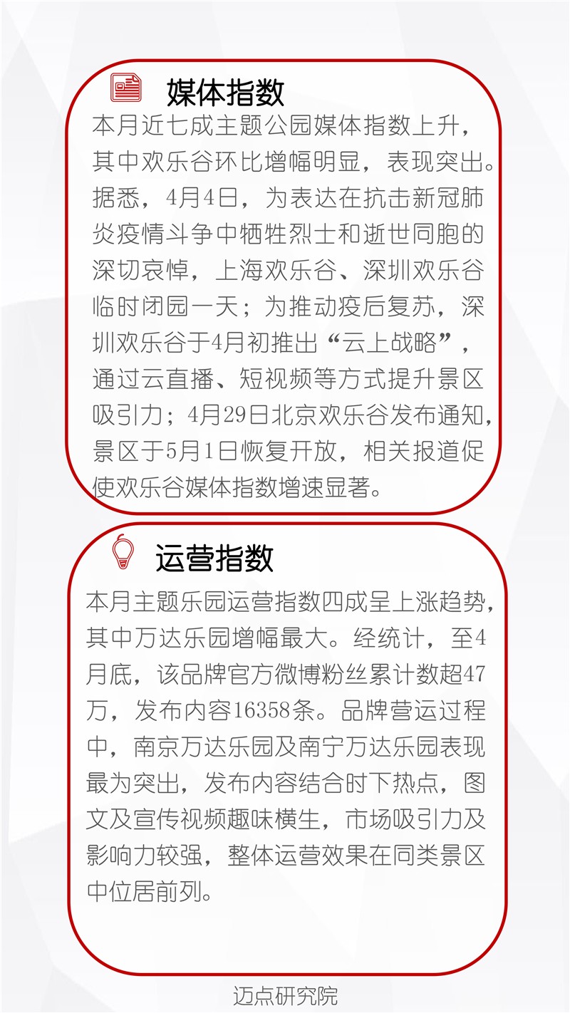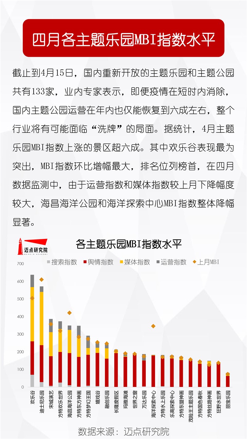 2020年4月主题乐园品牌发展报告 迈点研究院 · 张迪 · 2020-05-22 08:10:41 分享到 打开微信“扫一扫”,打开网页后点击屏幕右上角分享按钮。 截止到4月15日,国内重新开放的主题乐园和主题公园共有133家,业内专家表示,即便疫情在短时内消除,国内主题公园运营在年内也仅能恢复到六成左右,整个行业将有可能面临“洗牌”的局面。 主题乐园 品牌发展报告 旅游 5