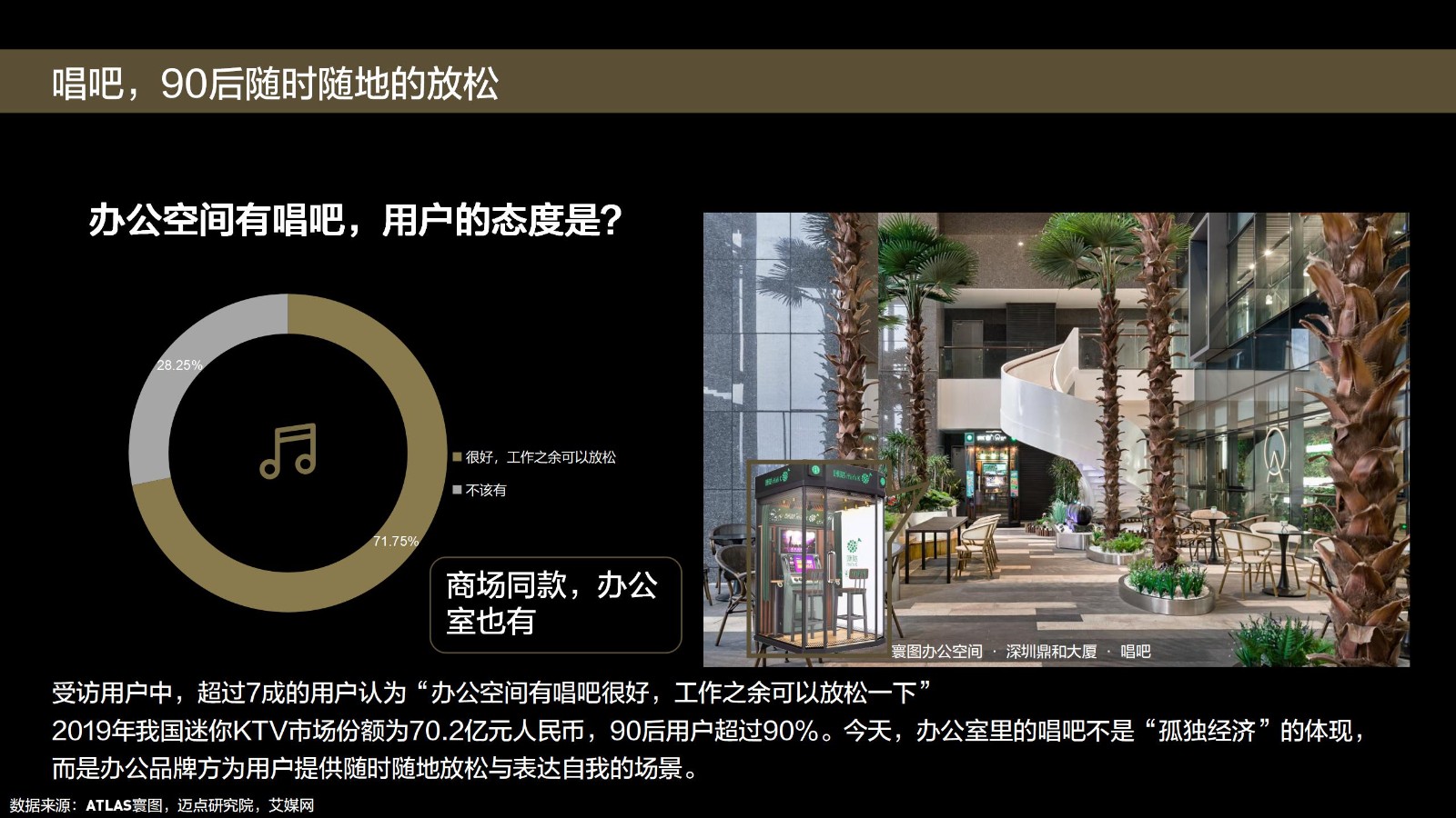 联合办公最主要的用户群体是90后。90后是大家“关注”的群体。说关注,一方面是基于数量,3.2亿人,占我国总人口的23%。另一方面,或是因为90后的“能挣敢花”。BCG的一项调研数据预测,我国90后到2021年,其消费量将占总消费量的近70%。90后成为了品牌眼中的香饽饽,主流调研机构更是有超过100份各个类目的“90后消费报告”。“生活方式”是近年的热词,生活方式品牌也成为“流量”品牌。生活方式品牌没有局限,服饰、电子产品甚至书店都可以是。不同的产品,相同的是体现“态度”。90后的消费好比是“投票”,有态度,不人云亦云,有自己的兴趣,更有自己的标准,弱化了刚需,有的是让生活方式更美好的心甘情愿与投入。以科技消费为例,根据毕马威的调研,74%的中国90后对与新兴技术相关的产品和服务感兴趣。把科技配套与智能硬件更多的应用在办公空间,90后可能更喜欢。