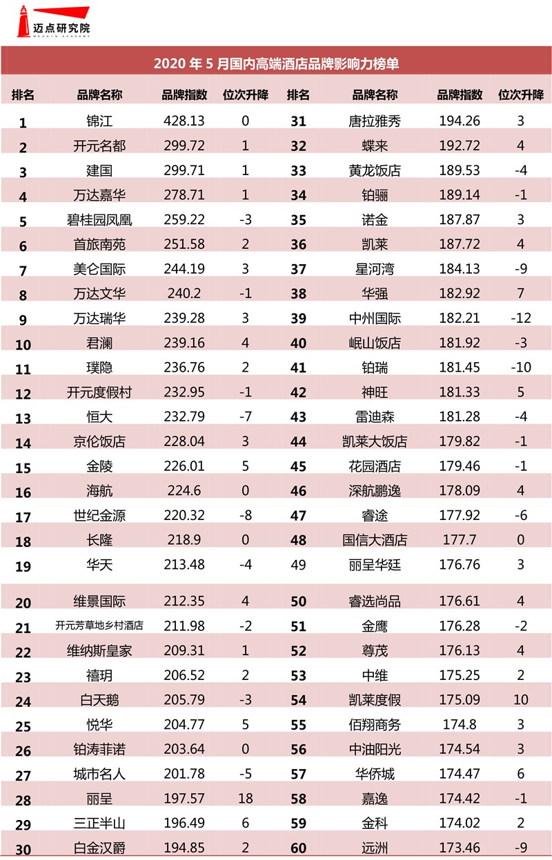 本月迈点研究院最新独家发布的“2020年5月中国住宿业国际高端/国内高端酒店品牌影响力榜单”中,洲际、希尔顿、万豪、凯悦、皇冠假日、喜来登、香格里拉、温德姆、万丽和四季成为国际高端酒店品牌TOP10;而国内高端酒店品牌前十名则分别是锦江、开元名都、建国、万达嘉华、碧桂园凤凰、首旅南苑、美仑国际、万达文华、万达瑞华和君澜。
