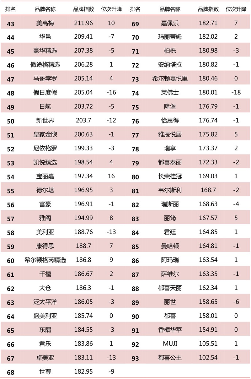 榜单内共计93家国际高端酒店品牌和116家国内高端酒店品牌。品牌影响力上,43.06%的品牌较上月环比上涨;分别来看,44.09%的国际高端酒店品牌环比上涨,42.24%的国内高端酒店品牌环比上涨。品牌排名上,44.02%的品牌环比上升;分别来看,46.24%的国际高端品牌环比上升,42.24%的国内高端品牌环比上升。具体榜单如下: