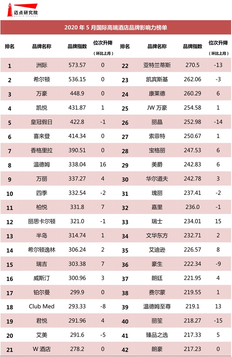 “2020年5月国际高端/国内高端酒店品牌影响力榜单”数据来源于迈点品牌指数MBI,根据5月迈点品MBI 八大旅游住宿业品牌类目中的865家品牌数据汇总统计而成。具体说明如下: