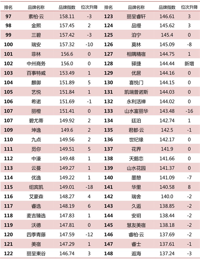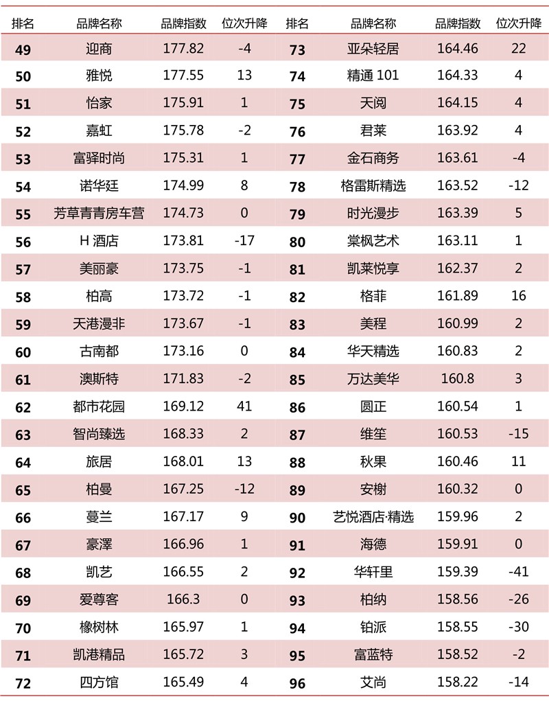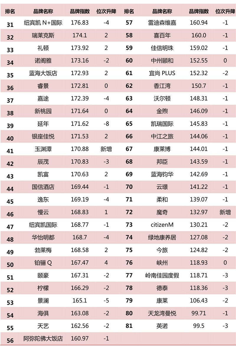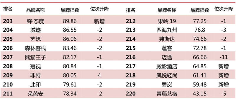 榜单内共计81家全服务中档酒店品牌和220家有限服务中档酒店品牌。品牌影响力上,45.51%的品牌较上月环比上涨;分别来看,37.04%的全服务中档酒店品牌环比上涨,48.64%的有限服务中档酒店品牌环比上涨。品牌排名上,33.55%的品牌环比上升;分别来看,28.40%的全服务中档酒店品牌环比上升,35.45%的有限服务中档酒店品牌环比上升。具体榜单如下: