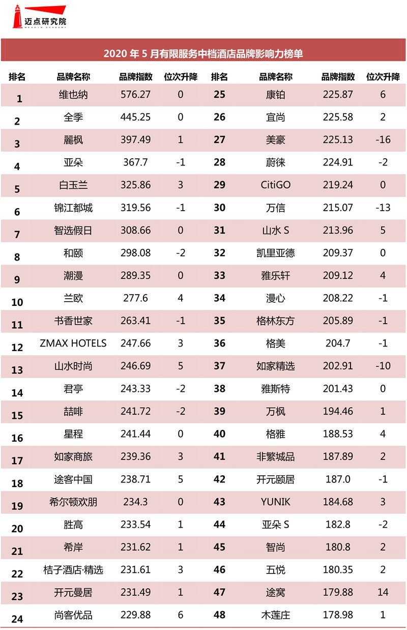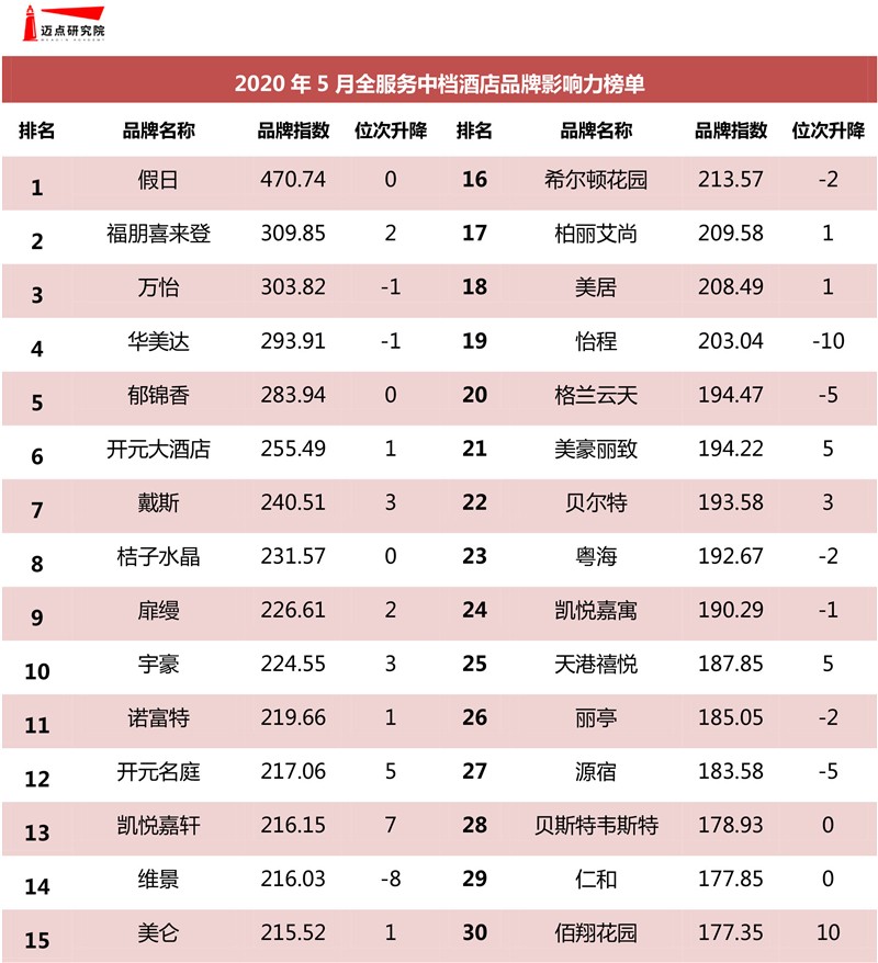 本月迈点研究院最新独家发布的“2020年5月中国住宿业全服务中档/有限服务中档酒店品牌影响力榜单”中,假日、福朋喜来登、万怡、华美达、郁锦香、开元大酒店、戴斯、桔子水晶、扉缦和宇豪成为全服务中档酒店品牌TOP10;有限服务中档酒店品牌前十名则分别是维也纳、全季、麗枫、亚朵、白玉兰、锦江都城、智选假日、和颐、潮漫和兰欧。