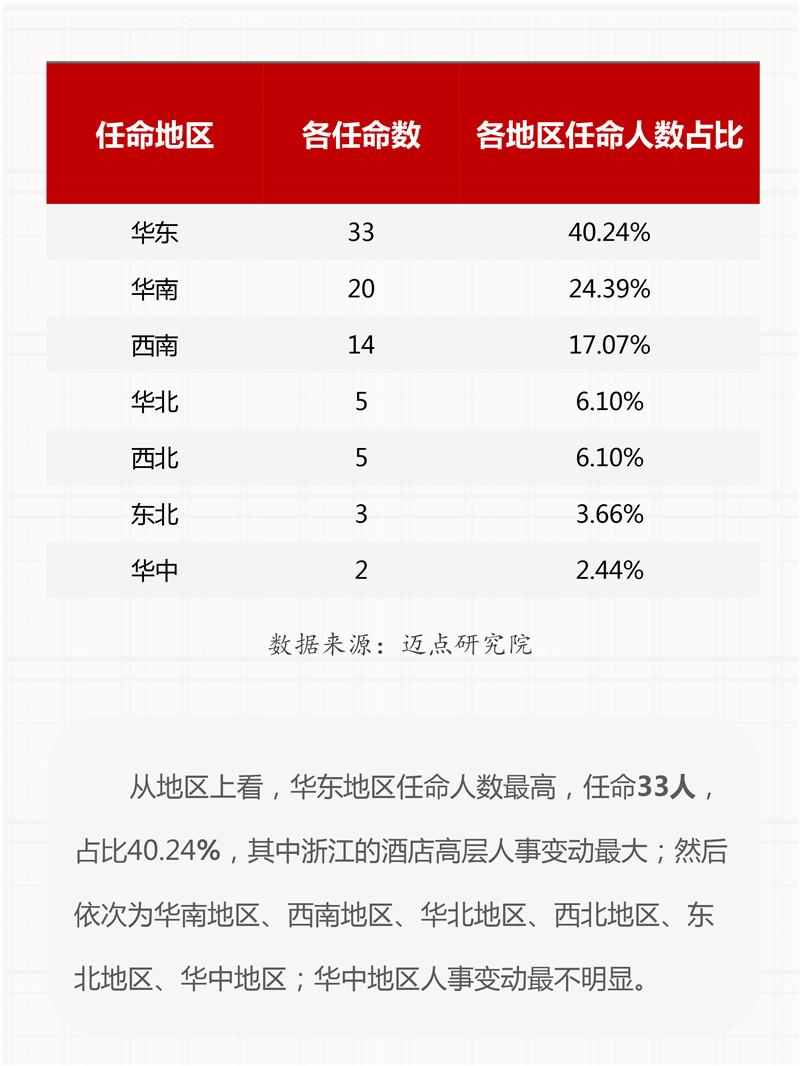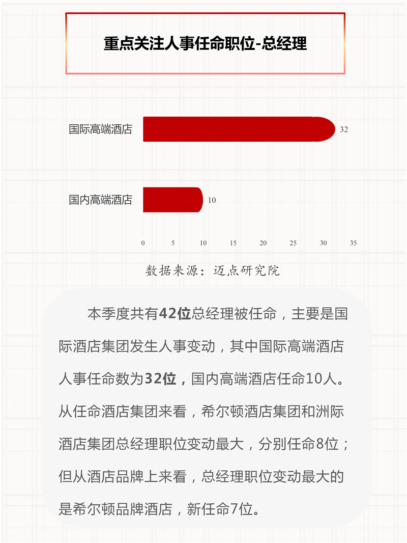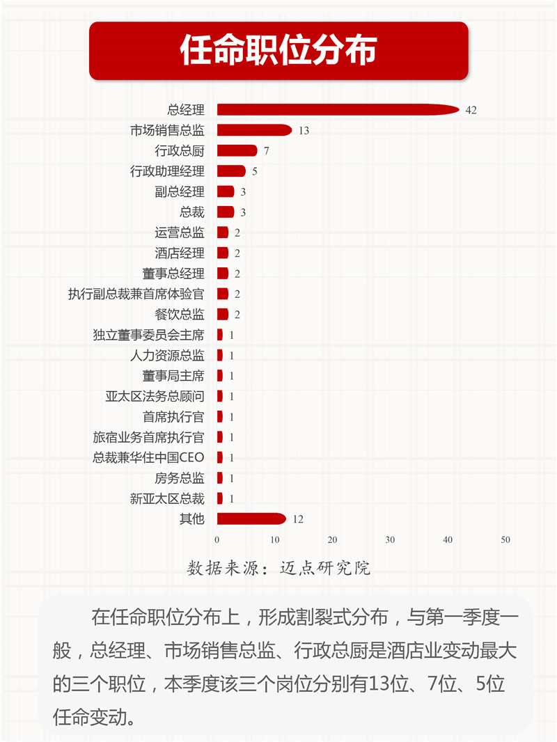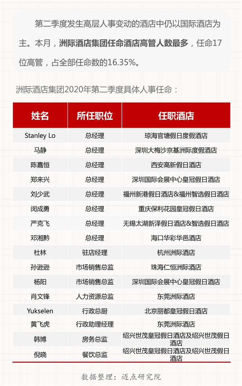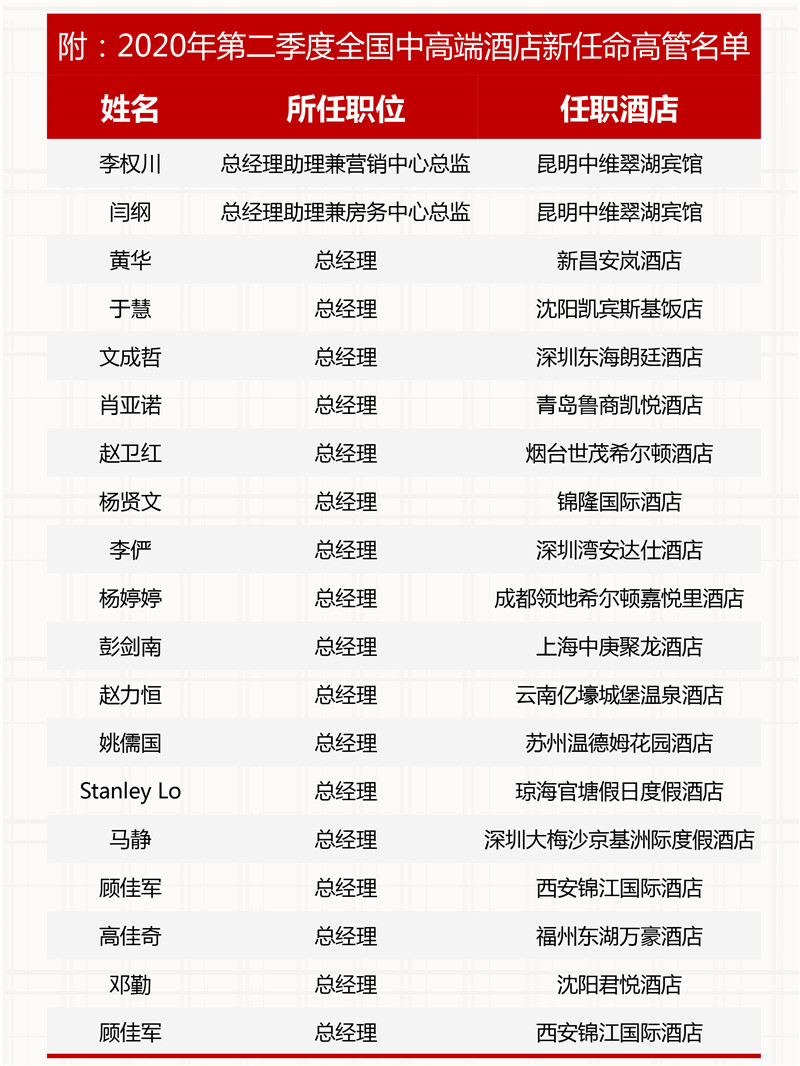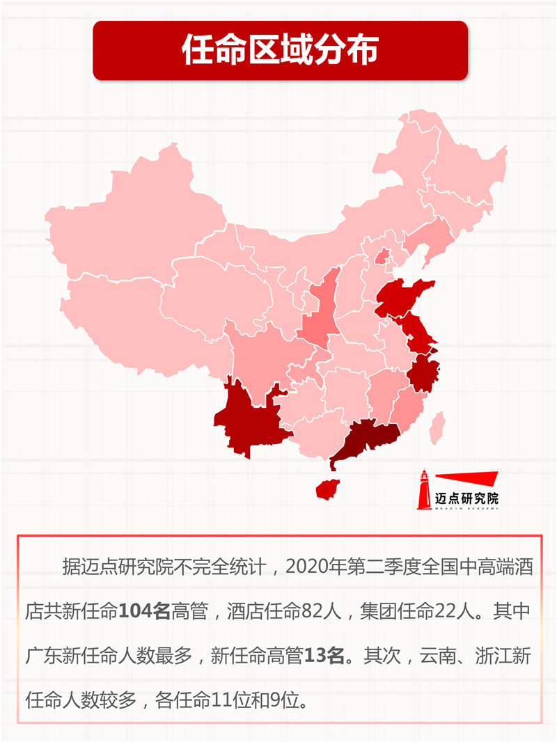 2020年第二季度酒店业高层人事变动统计报告 迈点研究院 · 杨丽 · 2020-07-01 08:48:26 分享到 打开微信“扫一扫”,打开网页后点击屏幕右上角分享按钮。 据迈点研究院不完全统计,2020年第二季度全国中高端酒店共新任命104名高管,酒店任命82人,集团任命22人。 人事变动统计报告 酒店市场 8