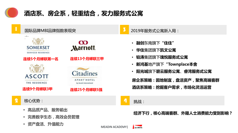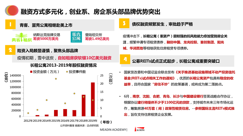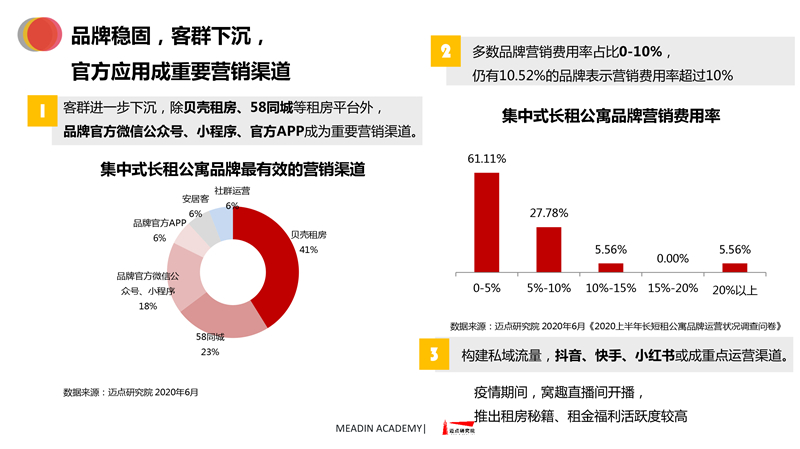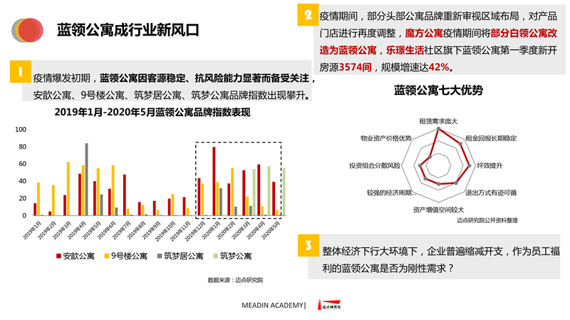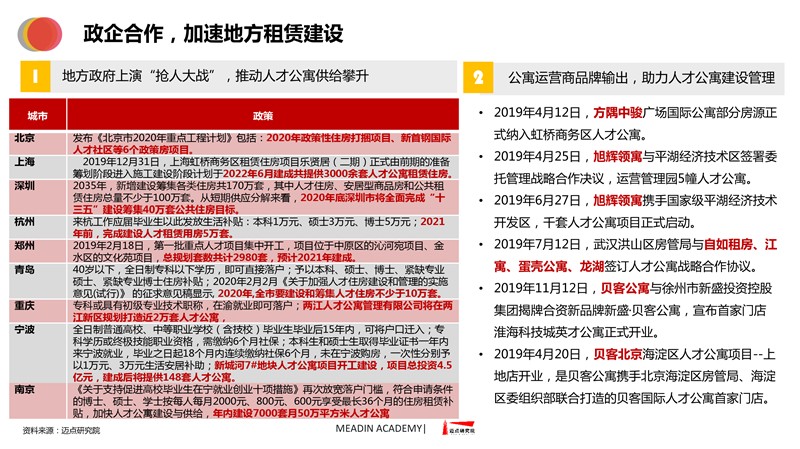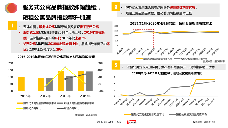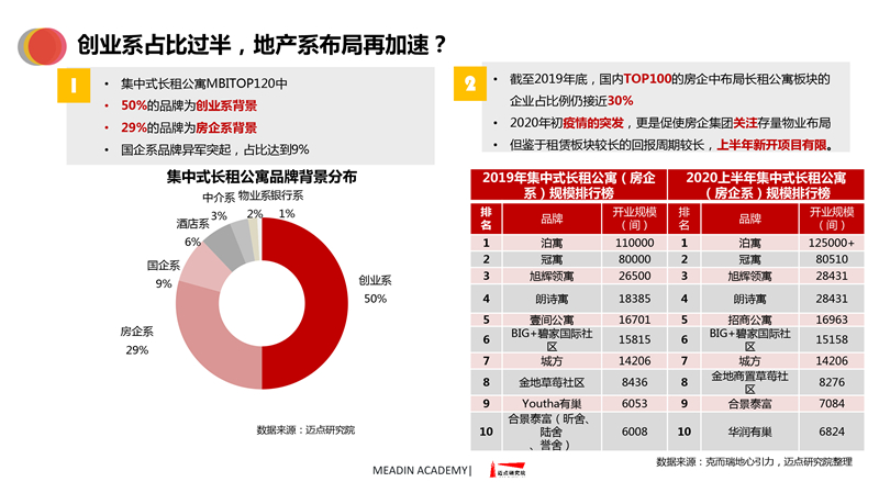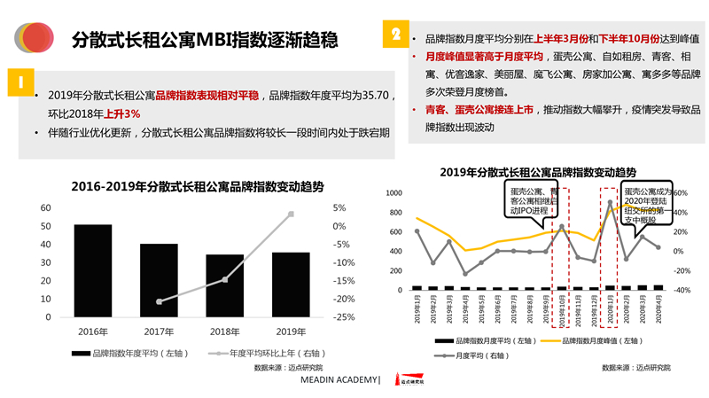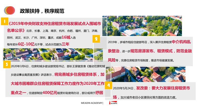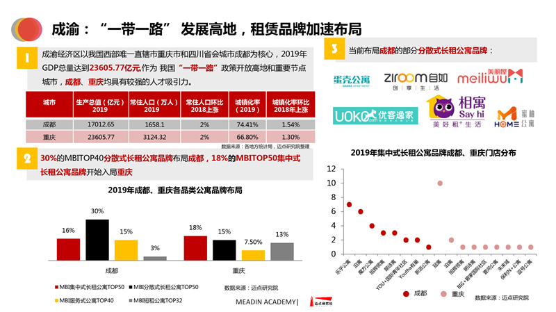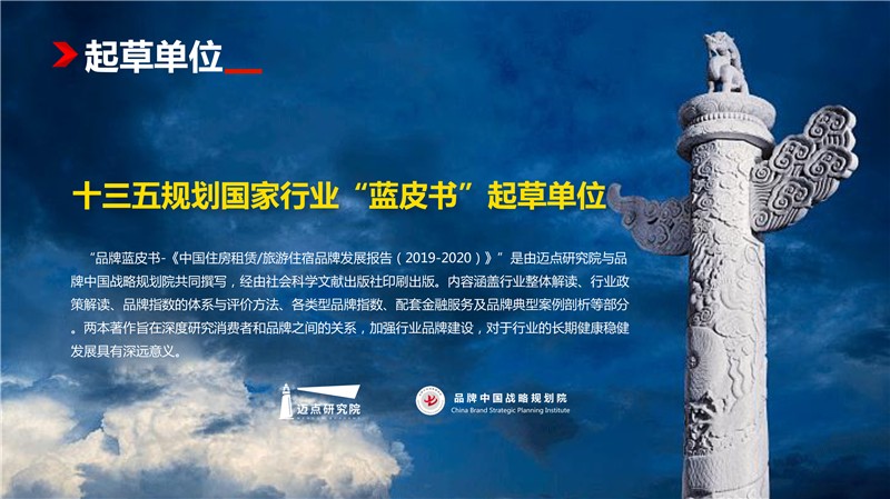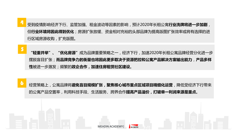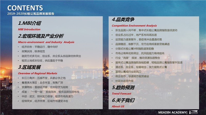 2019-2020长租公寓品牌发展报告 迈点研究院 · 任开荟 · 2020-07-23 10:00:55 分享到 打开微信“扫一扫”,打开网页后点击屏幕右上角分享按钮。 经济趋稳,行业承压,长租公寓品牌聚焦热点城市区域发展;各品类加速融合、探索,品牌竞争一再加剧;政策扶持推动租赁社区建设落地。 长租公寓 年度 发展报告 品牌 9