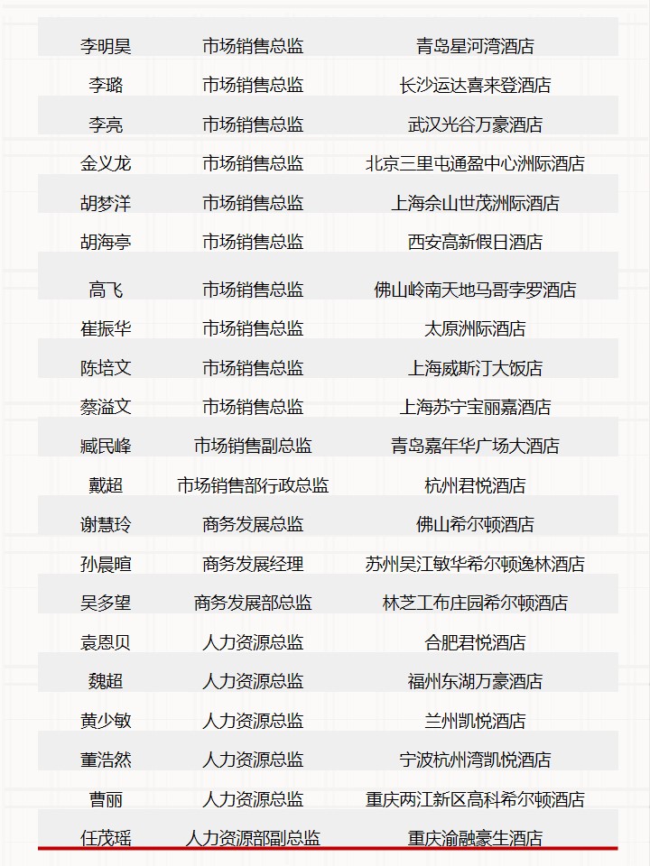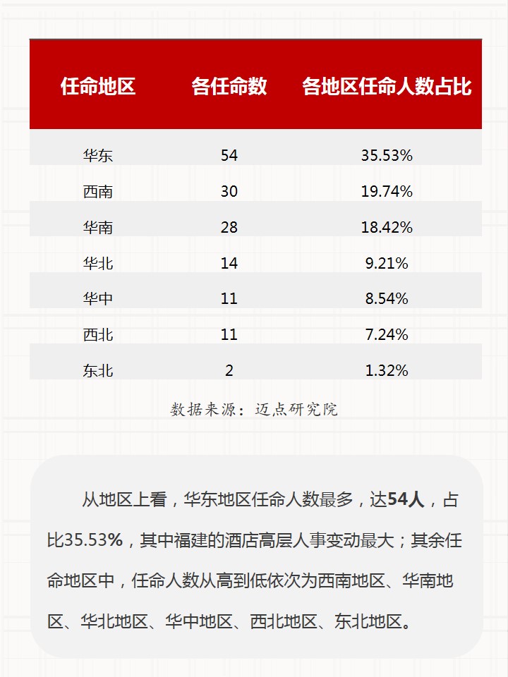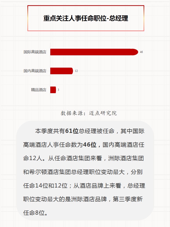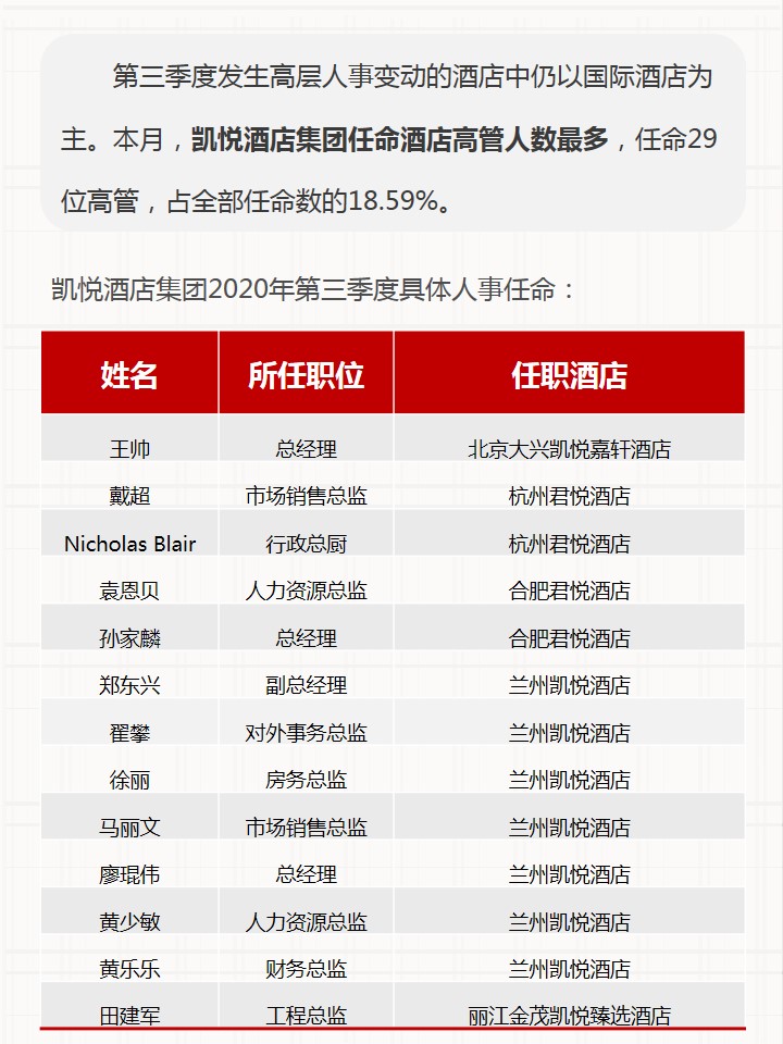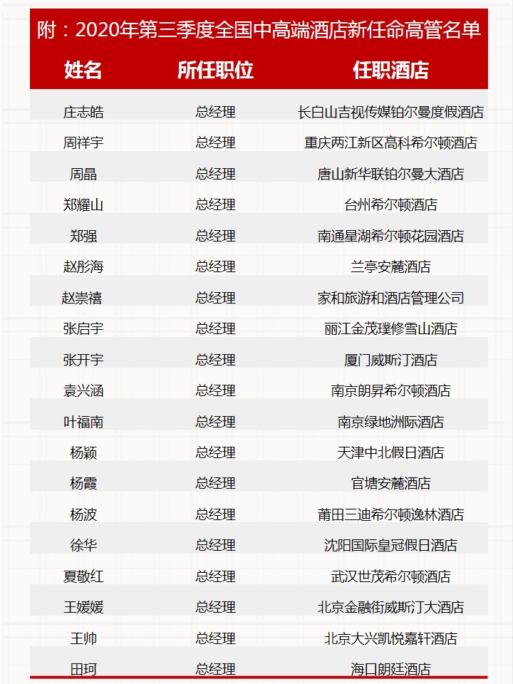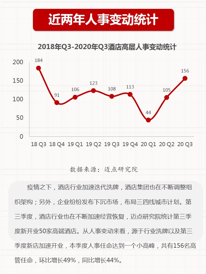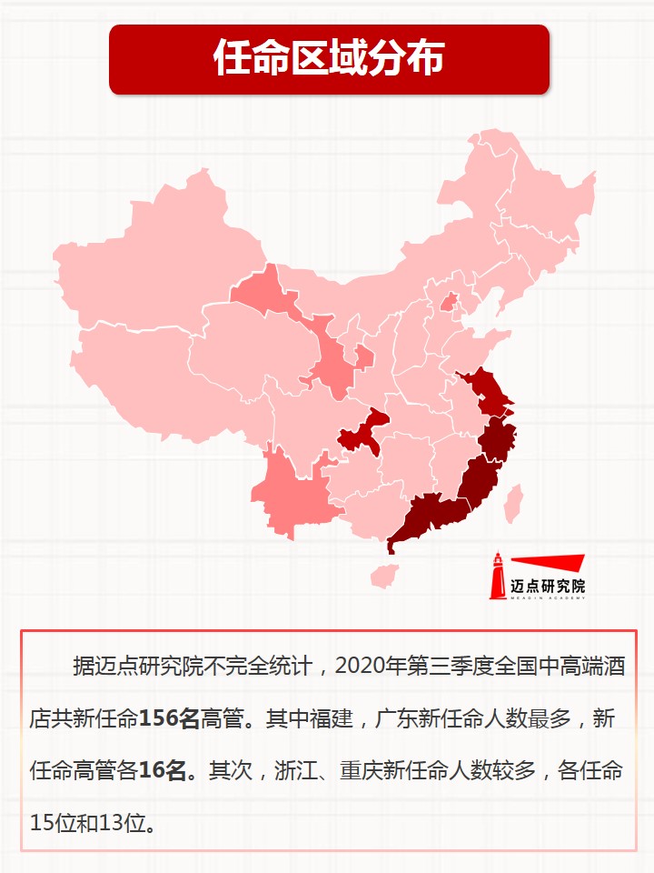 2020年第三季度酒店业高层人事变动统计报告 迈点研究院 · 崔志远 · 2020-10-06 08:04:43 分享到 打开微信“扫一扫”,打开网页后点击屏幕右上角分享按钮。 据迈点研究院不完全统计,2020年第三季度全国中高端酒店共新任命156名高管。 人事变动 酒店市场 8