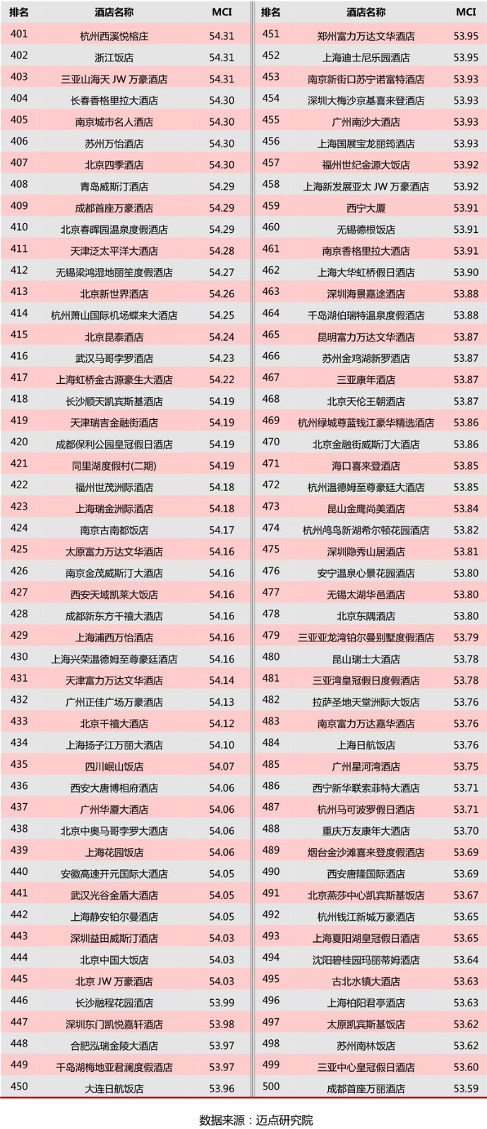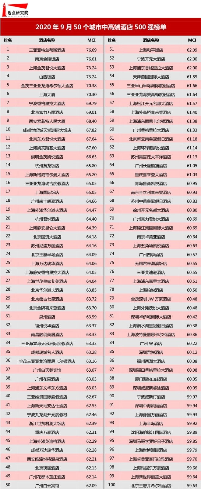 “2020年9月50个城市中高端酒店500强榜单”数据来源于迈点区域酒店舆情指数MCI,根据8月迈点区域酒店舆情指数MCI的8890家中高端酒店数据汇总统计而成。具体说明如下:
