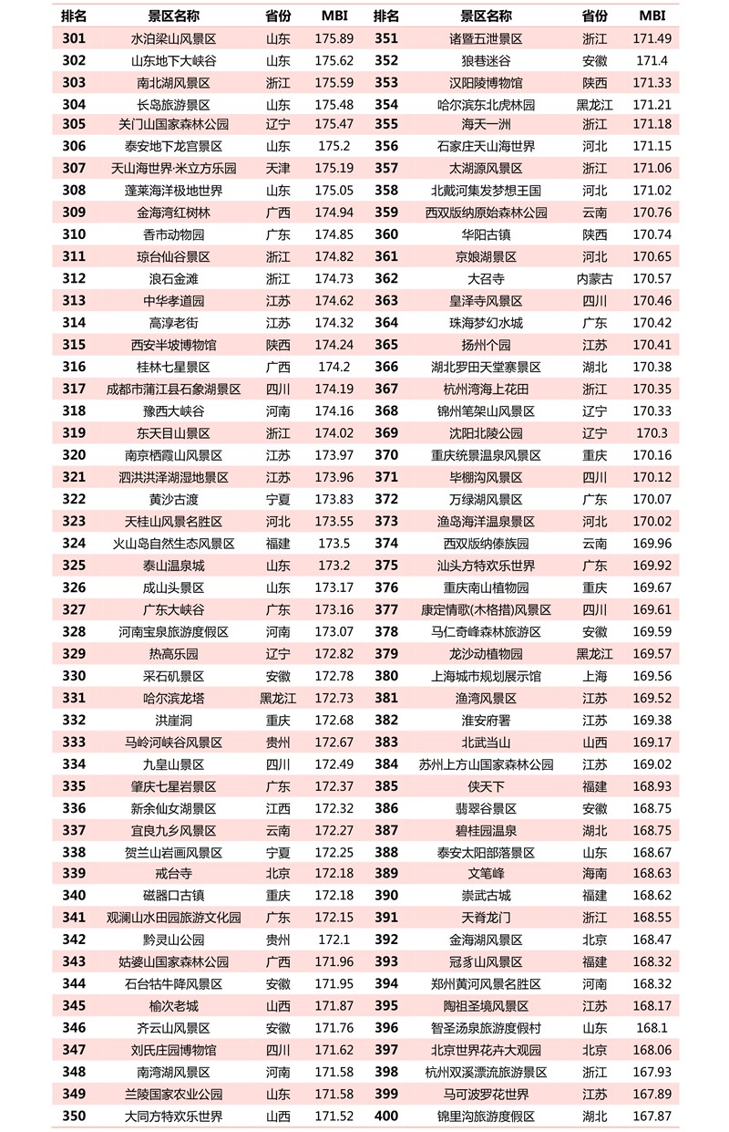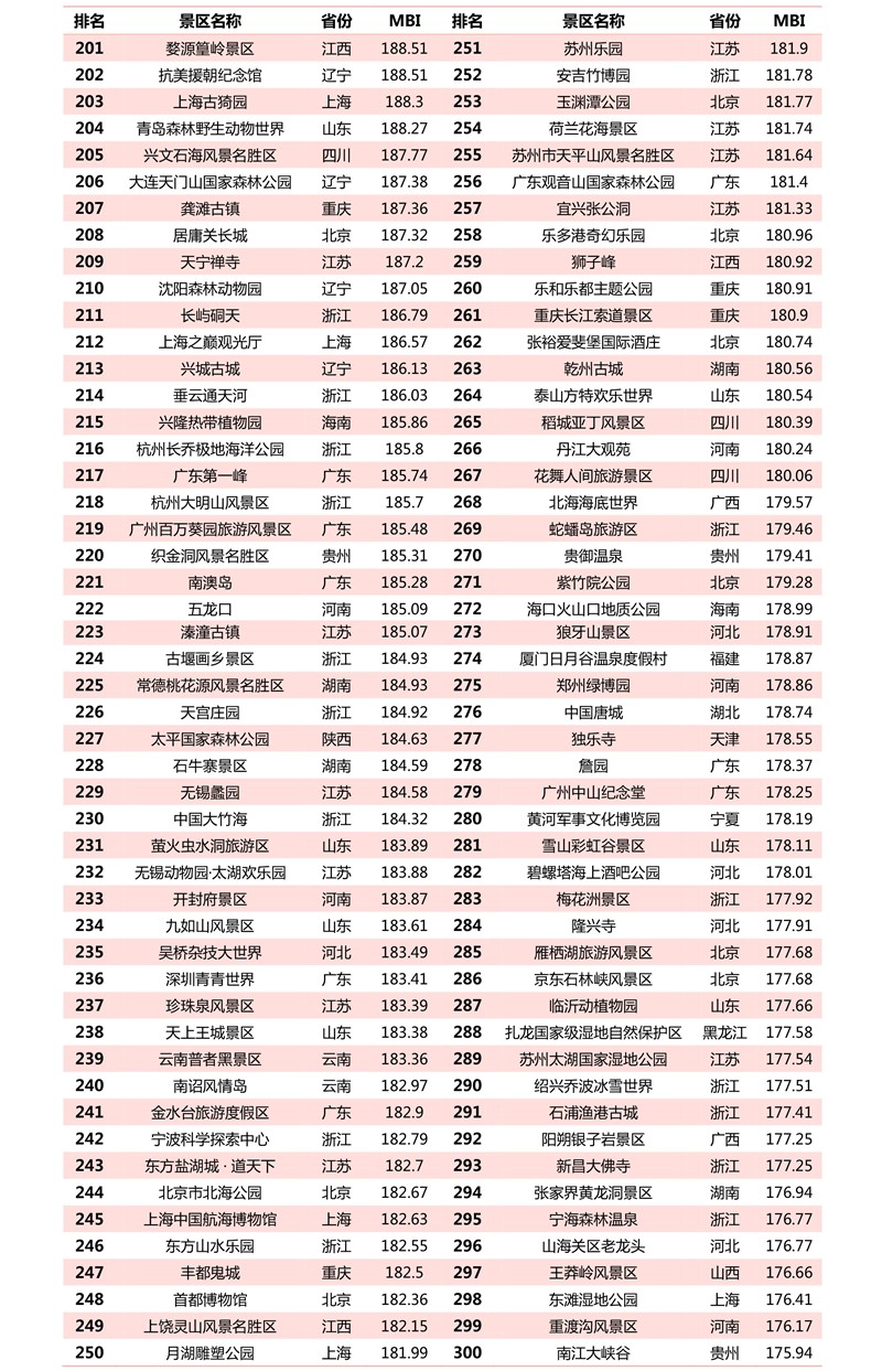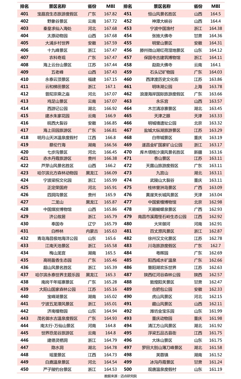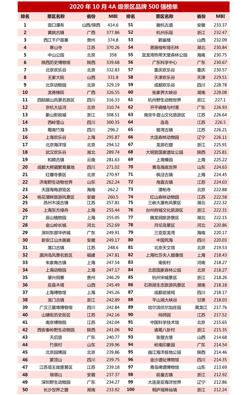 “2020年10月4A级景区品牌500强榜单”数据来源于迈点品牌指数MBI,根据10月迈点品牌指数MBI的2827个4A景区数据汇总统计而成。具体说明如下: