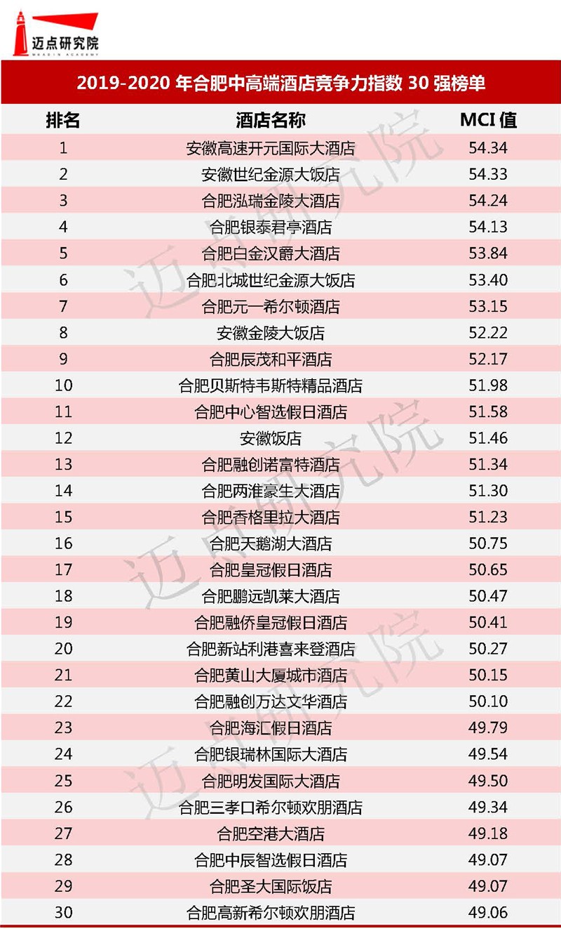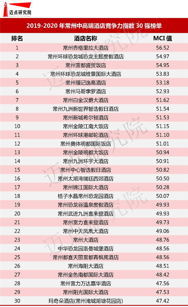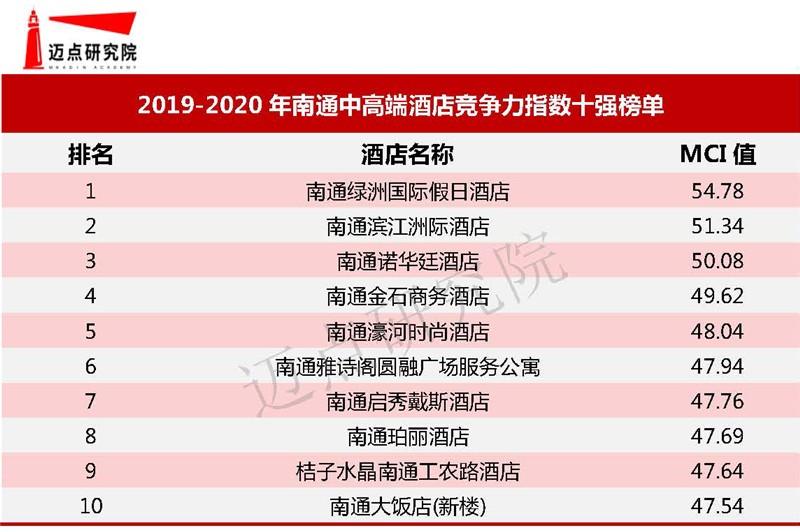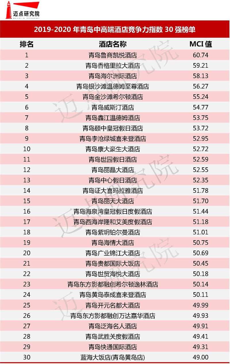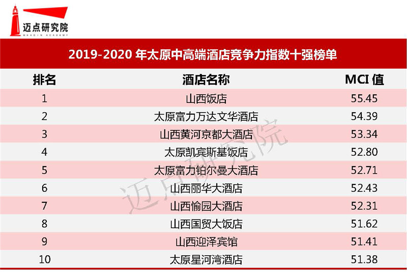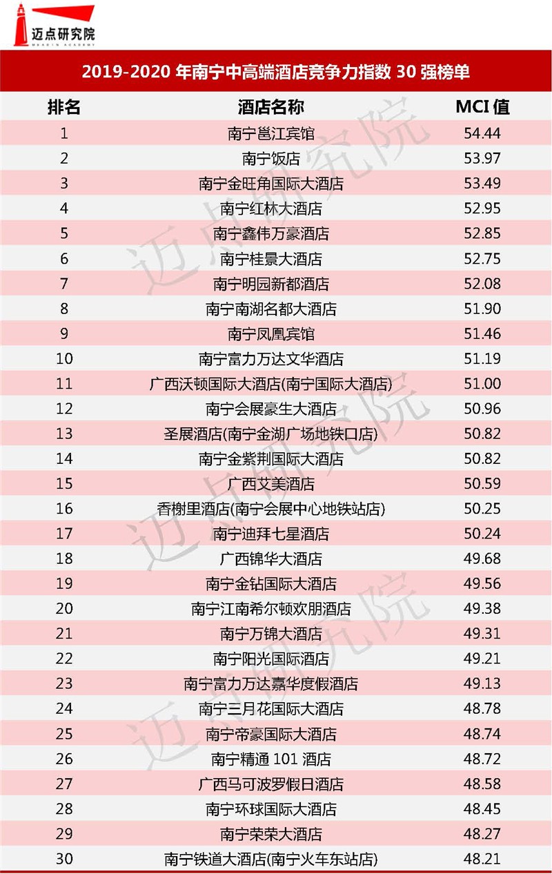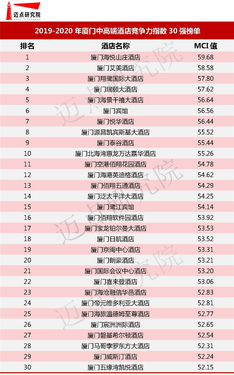 2019-2020年50个城市中高端酒店竞争力指数排行榜(下) 迈点研究院 · 2020-12-10 08:50:00 分享到 打开微信“扫一扫”,打开网页后点击屏幕右上角分享按钮。 酒店竞争力指数是由品牌中国战略规划院指导,迈点研究院独家发布,通过监测单体酒店在互联网和移动互联网的用户点评、运营、媒体数据,用以反映一段时期内酒店的运营力、媒体关注度和客群喜爱度。 50个城市中高端酒店竞争力指数头部排名情况 酒店 中高端酒店 排行榜 9