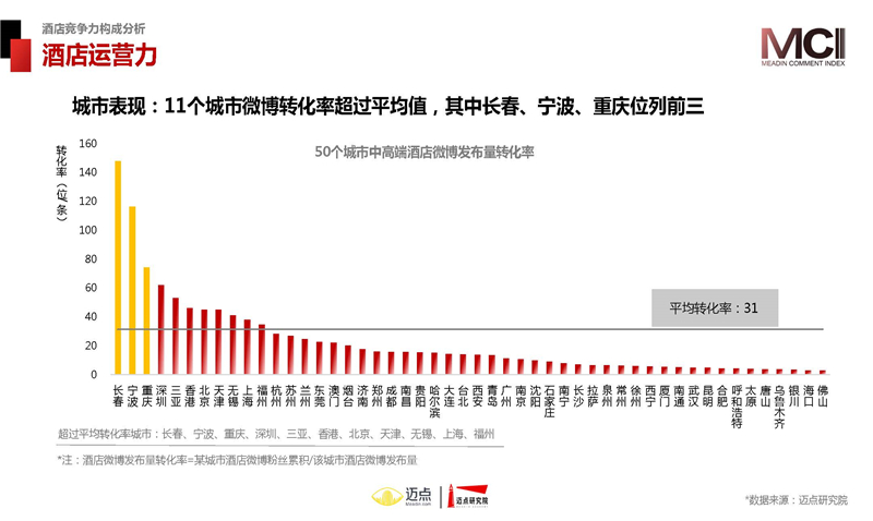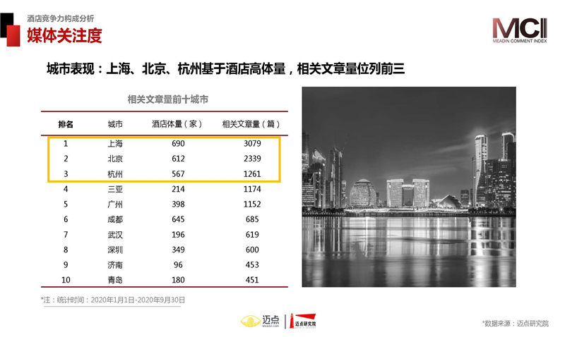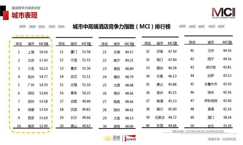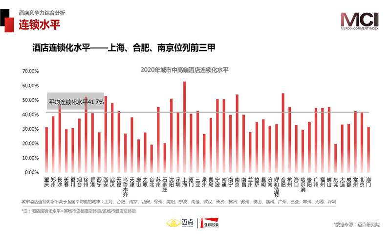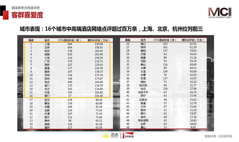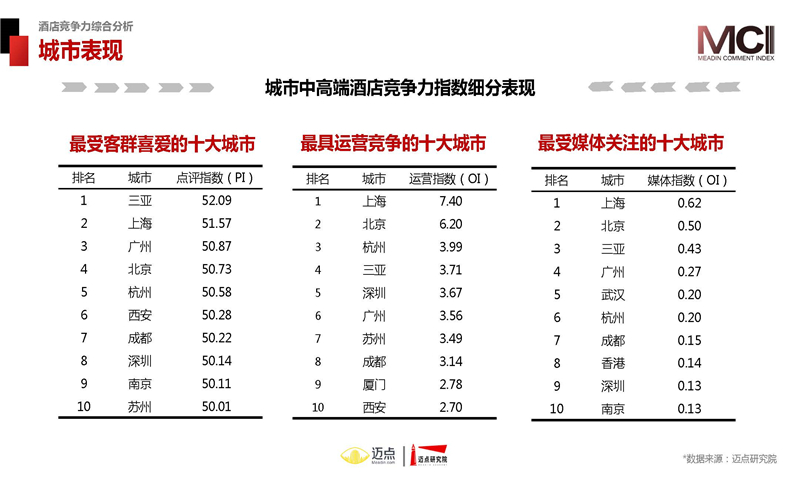 50个城市中高端酒店竞争力报告(2019-2020) 迈点研究院 · 杨丽 · 2020-12-11 09:00:59 分享到 打开微信“扫一扫”,打开网页后点击屏幕右上角分享按钮。 酒店竞争力指数是由品牌中国战略规划院指导,迈点研究院独家发布,通过监测单体酒店在互联网和移动互联网的用户点评、运营、媒体数据,用以反映一段时期内酒店的运营力、媒体关注度和客群喜爱度。 酒店 中高端酒店 报告 16