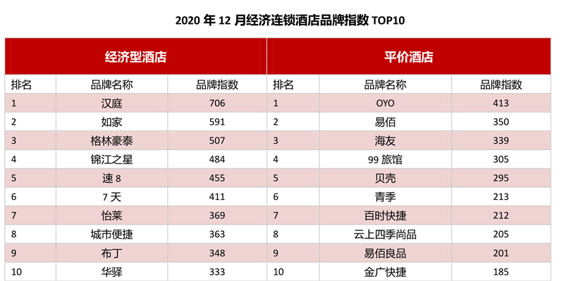 以下是迈点研究院独家发布“2020年12月酒店品牌影响力100强榜单”。本月,汉庭、维也纳酒店、如家位列前三甲,另有洲际、假日、希尔顿、皇冠假日、喜来登、格林豪泰、全季进入榜单前十。本月100强榜单中,11个品牌的品牌指数环比呈现下降态势,89个品牌的品牌指数环比呈现上涨态势,其中30个品牌的品牌指数环比增长超过20%。本月有20个新晋入榜酒店品牌,包括华驿、如家商旅、美豪、维景国际、花筑、瑞士、宜尚、贝壳、格盟、IU酒店、英迪格、派柏云、如家精选、花间堂、尚客优、骏怡、尚客优品、丽呈、宜必思、都市118。