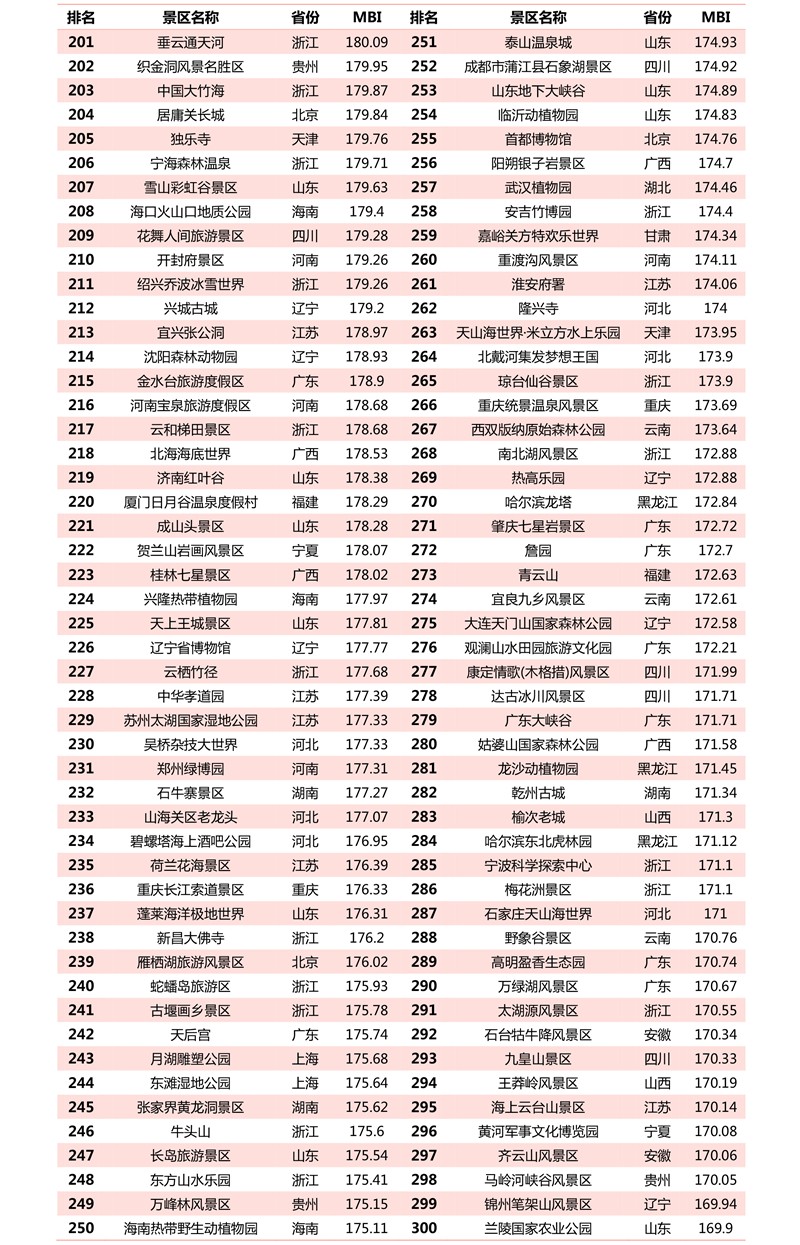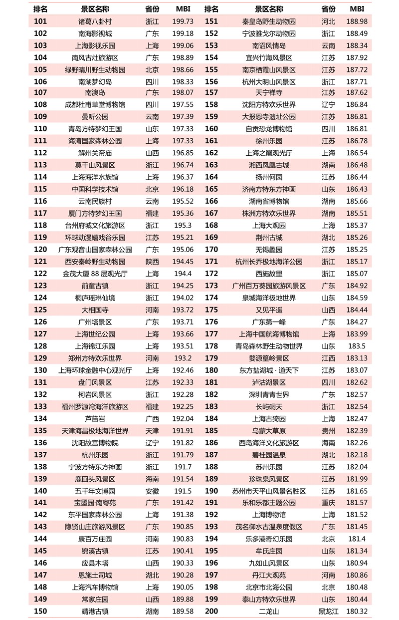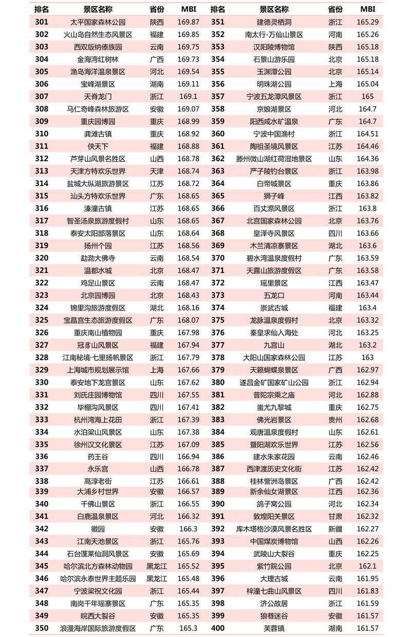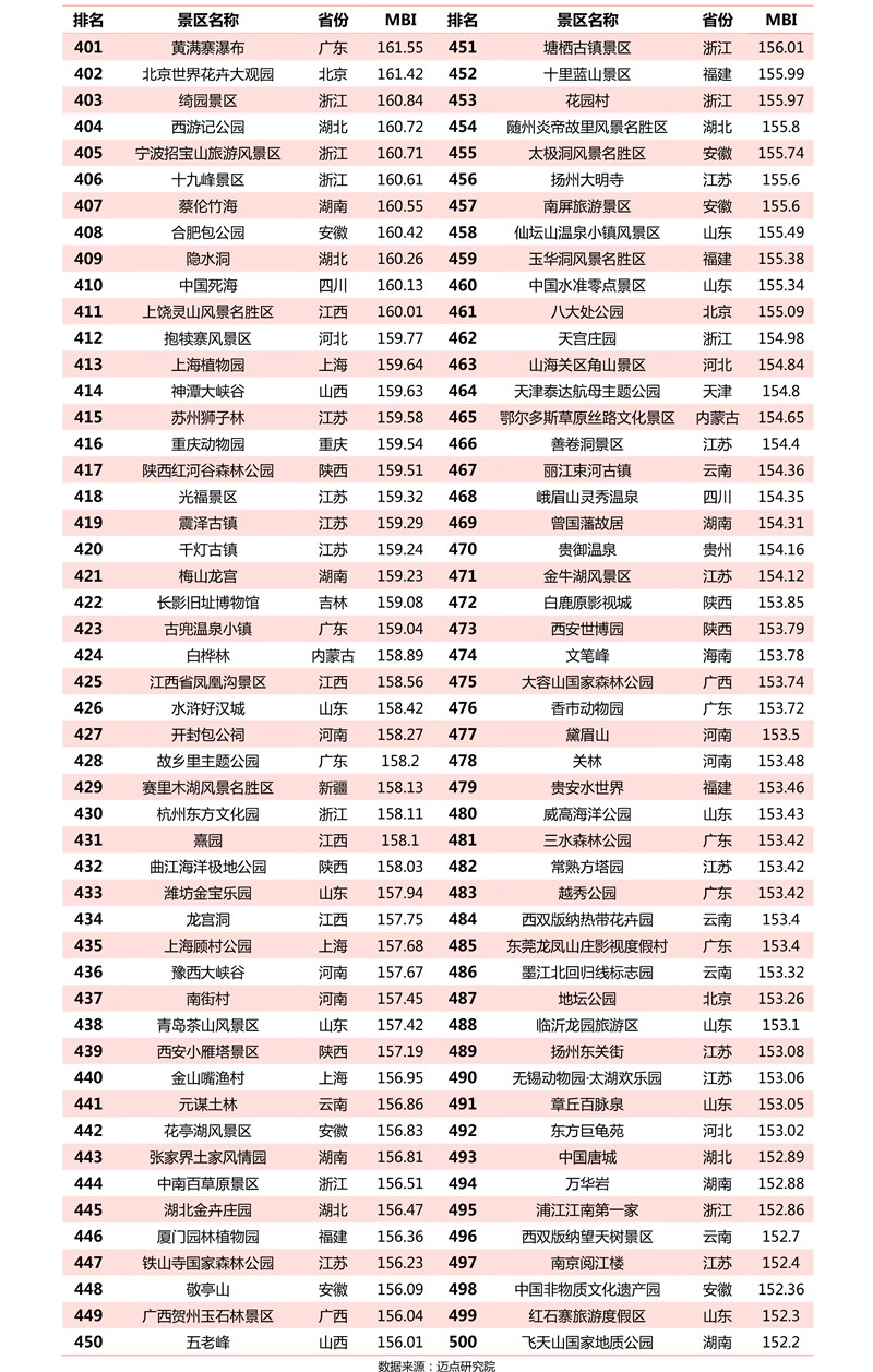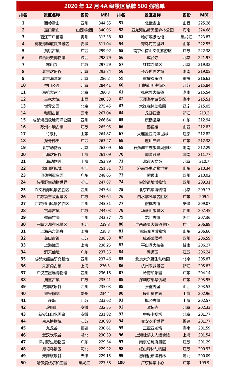 “2020年12月4A级景区品牌500强榜单”数据来源于迈点品牌指数MBI,根据12月迈点品牌指数MBI的2803个4A景区数据汇总统计而成。具体说明如下: