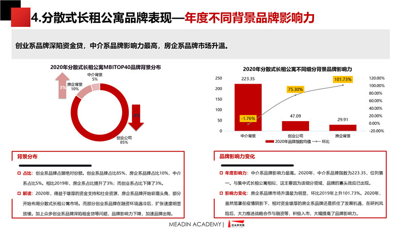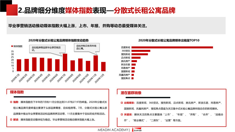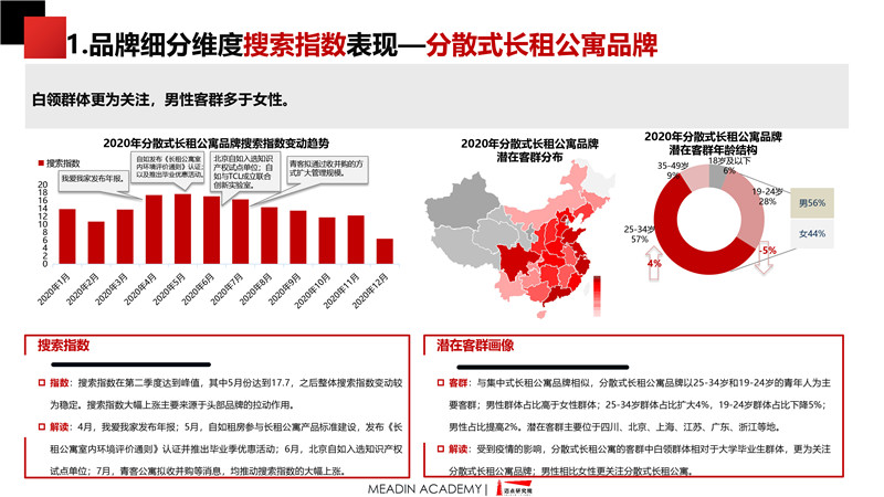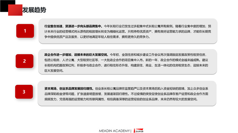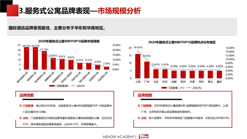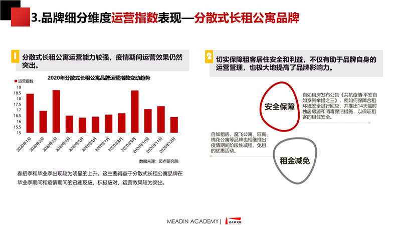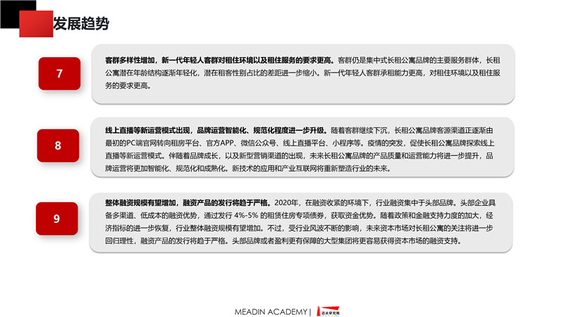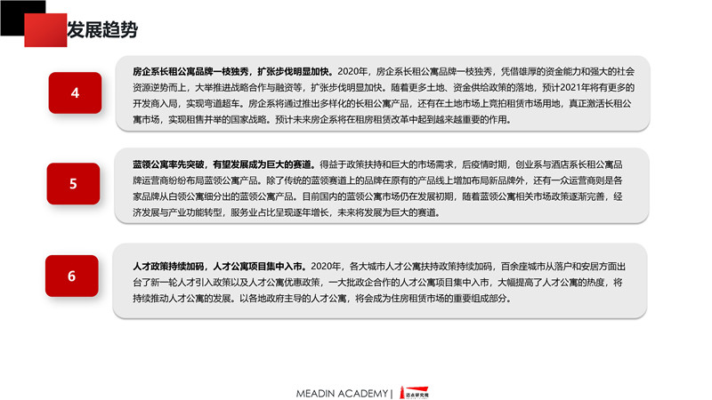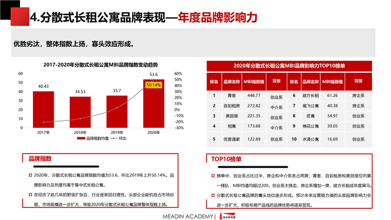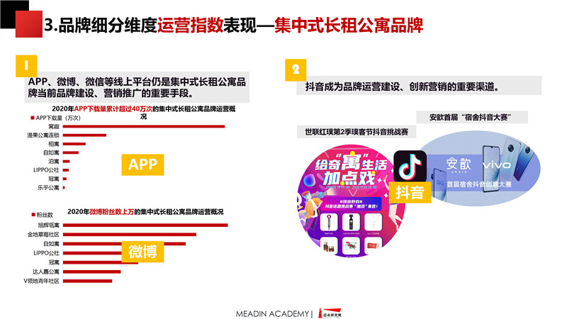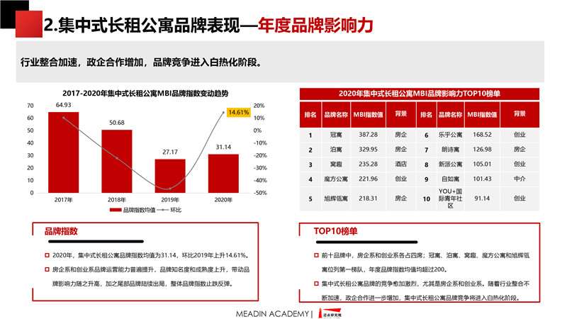 2020-2021中国住房租赁品牌发展报告 迈点研究院 · 2021-04-15 10:09:20 分享到 打开微信“扫一扫”,打开网页后点击屏幕右上角分享按钮。 2020年是住房租赁行业回归理性之年。在经历了前三年的野蛮扩张后,行业整合不断加速,市场逐步规范,收并购事件明显增加,政企合作模式也日渐成熟,头部品牌市场规模进一步扩大。 住房租赁 品牌公寓 租赁报告 3